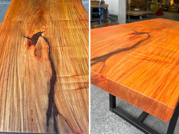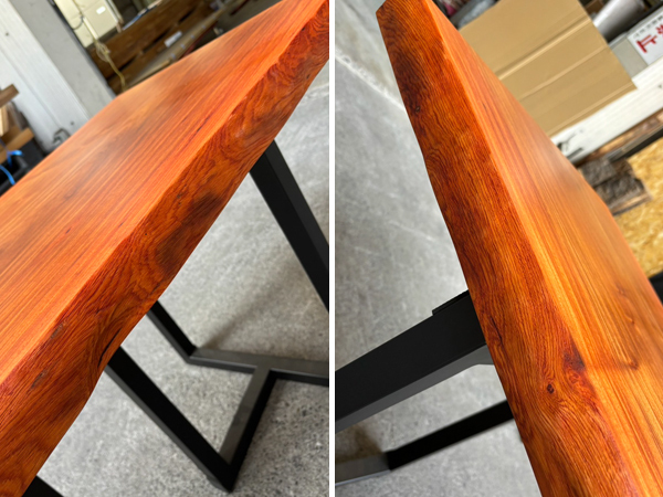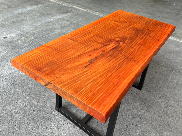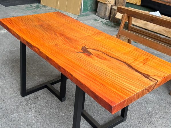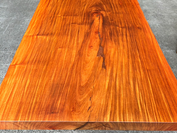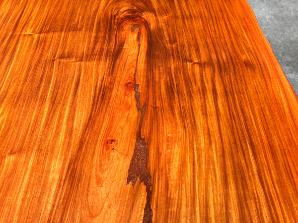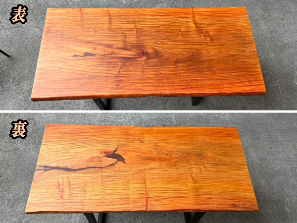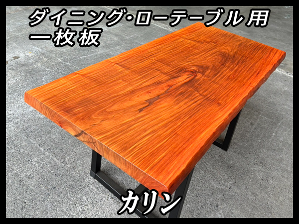【花梨(カリン) 性質】 | 花梨(カリン)は、花梨(カリン)はカンボジアやタイ、ベトナムなど、東南アジア原産のマメ科広葉樹です。 のど飴などで知られているバラ科のカリン(花)とは別で、光沢のある美しい木材として知られています。 心材は赤みがかった褐色で、歳月を経るとこの赤みがどんどん深まっていきます。 木肌が美しく、綺麗な光沢を持つ為、家具、楽器、内装などの装飾的な目的で使われることが多いです。 花梨(カリン)を使用した家具は一般的に高級品とされ、長さ、幅、ともになかなか手に入らないサイズの貴重な一枚です。 市場でもあまりお目にかかる事の無くなった為、一枚板テーブルサイズはとても希少です。 |