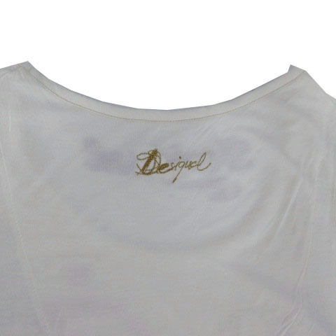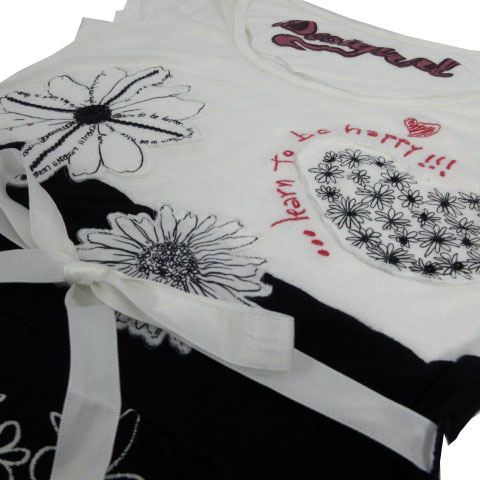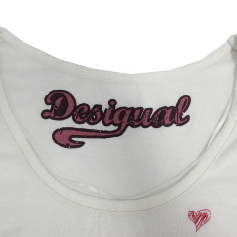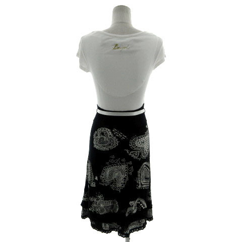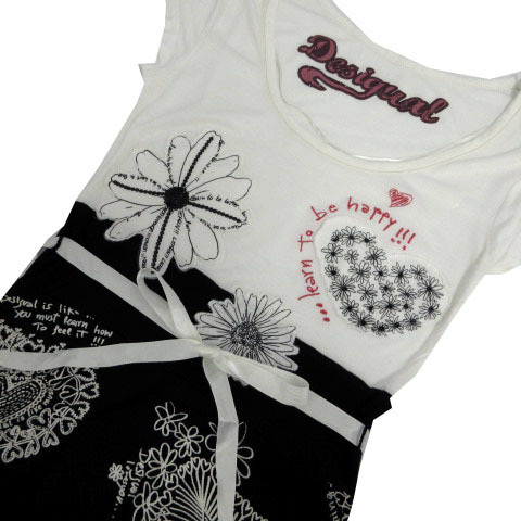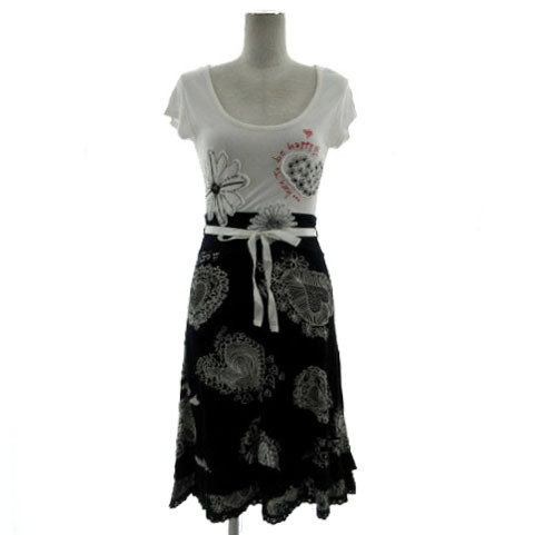 デシグアル Desigual ワンピース 刺繍 アップリケ スパンコール プリント 半袖 ミディ丈 リボンベルト ロゴ刺繍 配色 白 黒 赤 S