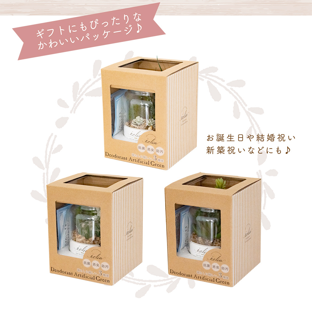 コンパクトなサイズで、玄関や洗面所、デスクなどインテリアのちょっとした場所を手軽に彩ります。中身の見えるクリアボックス入り。汚れにくく人やペットにも安全です。