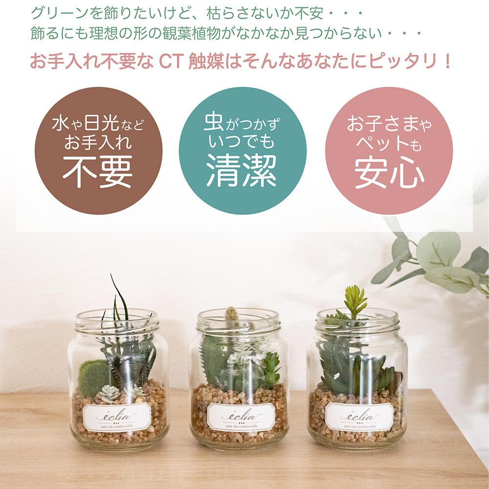 消臭、抗菌、空気を綺麗にするCT触媒のアーティフィシャルグリーン。CT触媒とは、生体必須ミネラルに含まれる元素から厳選したミネラル複合体のことで、非常に安全性が高く人やペットに無害です。CT触媒は、光が必要なく空気と触れているだけで、消臭、抗菌、マイナスイオン効果を発揮するため、あらゆる環境でご使用することでできます。