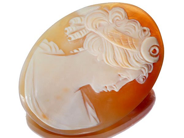 月の髪飾りの女神の彫刻が魅力的なシェルカメオルースを激安価格で特別大放出致します!