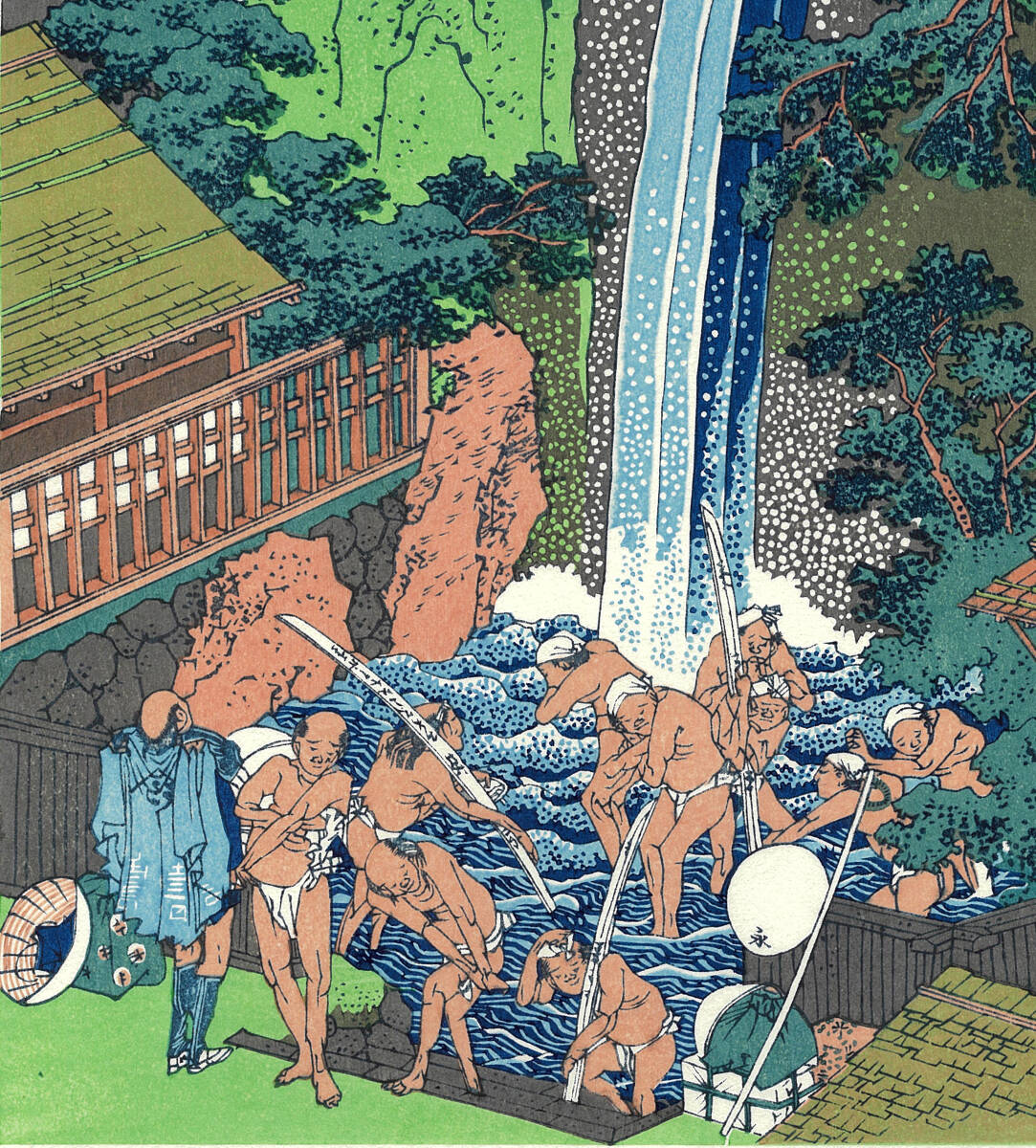 大山講と呼ばれる団体を組み、奉納する木太刀を持って登頂した。本図は開祖の名がついた良弁の瀧で水行を行う
