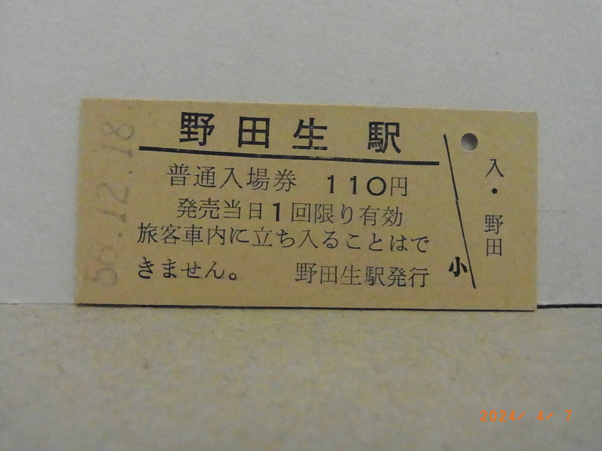 国鉄 函館本線 野田生駅 110円普通入場券 昭56.12.18 ★送料無料★