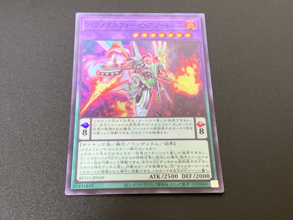 | 商品説明 | 商品説明、注意事項全てご覧の上で入札をお願いします。 入札して頂いた場合、上記に同意して頂いたと判断致しますので予めご了承下さい。 他の商品との同梱も可能です。その際は商品名とご一緒に取引ナビで必ずご連絡下さるようお願いします。 6枚までは定形郵便84円となります。それ以上ご希望の場合はその旨お伝え致します。 商品到着後、必ず受取連絡は行うようお願い致します。 又、不手際があった際は取引ナビでご連絡下さるようお願い申し上げます。 ■商品状態 【パラメタルフォーゼ・アゾートレス】スーパーレアです。 このカードの状態は「B+」です。 カードの状態は下記のようにS~Dにて表しております。 又、出品物によっては下記表現ではない場合が御座いますが 少しずつ修正していきますのでご理解下さいませ。 「S/ミント」 (未使用・パックから開けたばかりの状態。傷 汚れがほぼない物。) 「A/ニアミント」 ( 開封直後によくある綺麗な状態。若干の傷、痛みがある状態) 「B/エクセレント」 (多少の傷、痛みが見受けられたりする状態。) 「C/ベリーグッド」 (目立つ傷などがあったりする状態。スリーブをつけてプレイする分には差し支えのない状態。) 「D/プアー」 (傷、汚れがかなり目立つ状態。傷を気にされない方向け。) 「+-」で状態の補足を行う場合が御座います。 +=該当のランクより若干良いが1ランク上げるほどではない物。 -=該当のランクより若干低いが1ランク下げるほどではない物。 レリーフ特有の凹凸、反りに関しましては上記状態には反映しません。 又、海外版のお品は作りが粗いため、初期傷等が多い場合が御座います。 出来る限り当方が丁寧にチェックを行っていますが、人の手によるものですのでどうしても見落としなどがある場合が御座います。 過度に気にされる方は入札をご遠慮下さいませ。 表現の仕方など人それぞれ感じ方が違います。上記を踏まえた上で御入札を宜しく御願い致します |