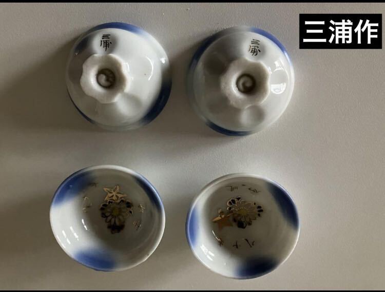 三浦作 金彩で手描き菊花と五角形星のお猪口4客でヒビ割れなどがない状態が良いと思います。
