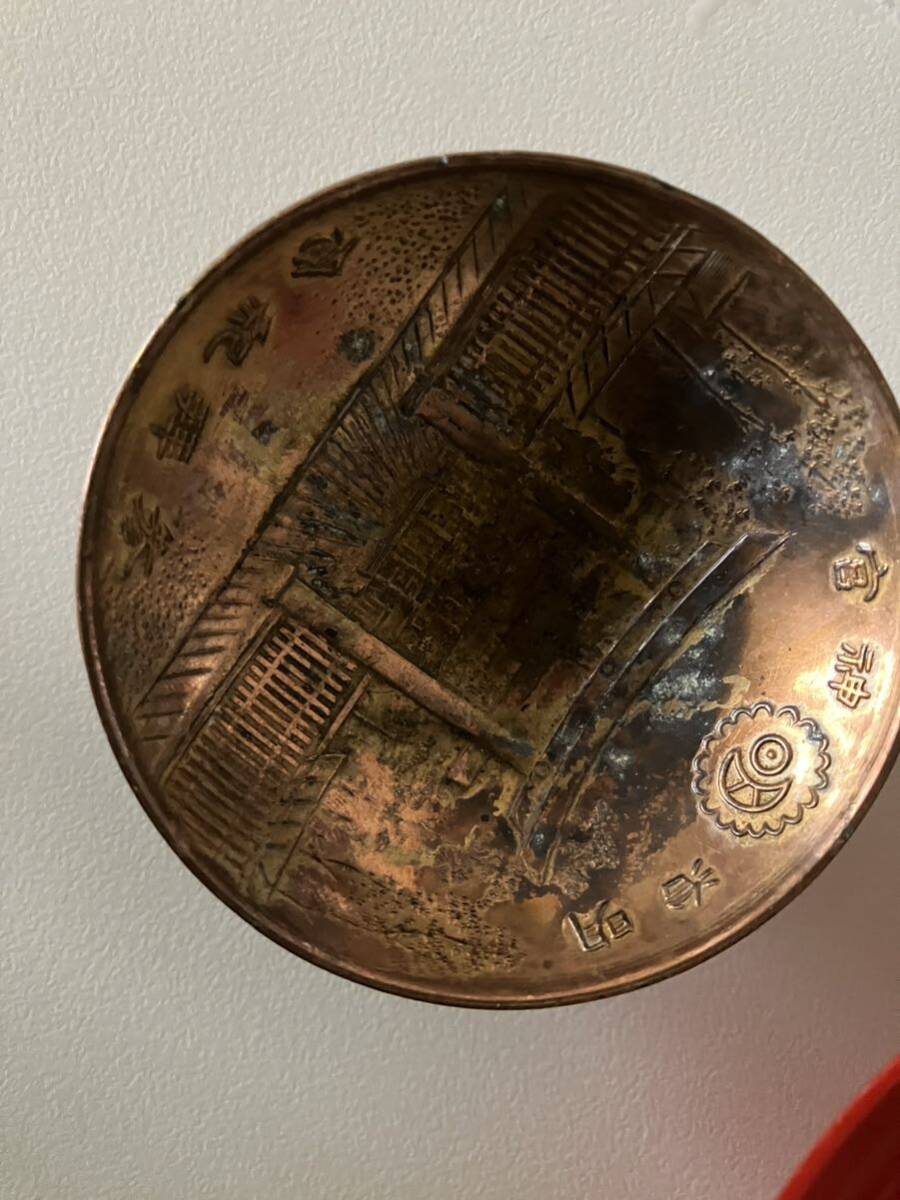 銅製の明治神宮のお猪口が神宮の模様を丁寧に彫が施された、とてもきれいだと思います。所々に錆が入ってました。年代物だからご理解いただけますような方にご購入を待っています。