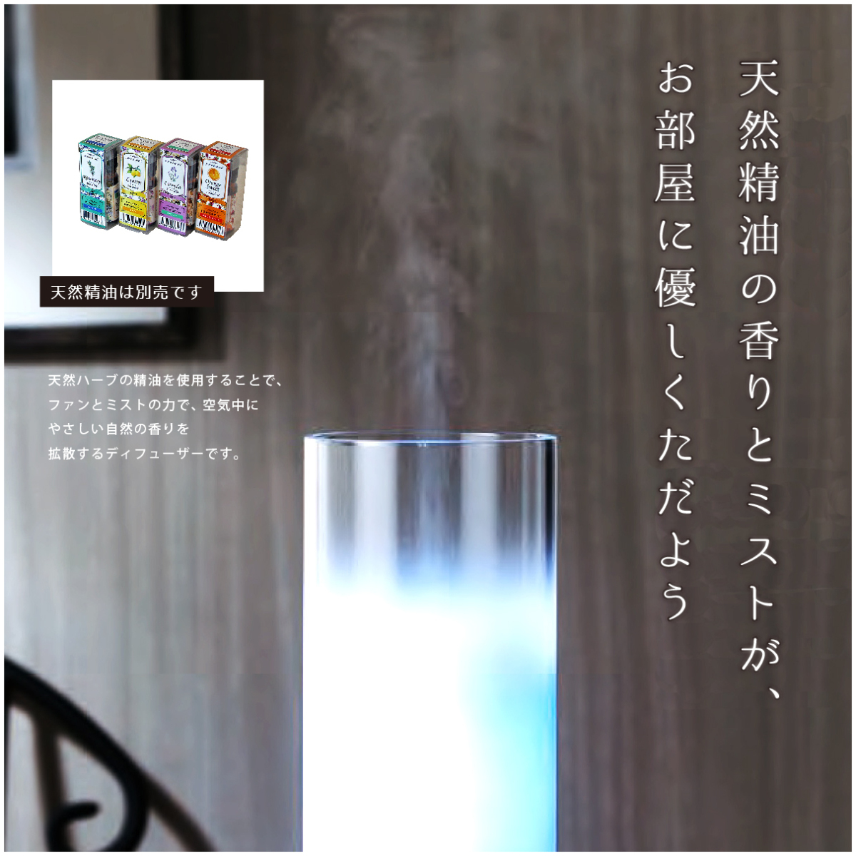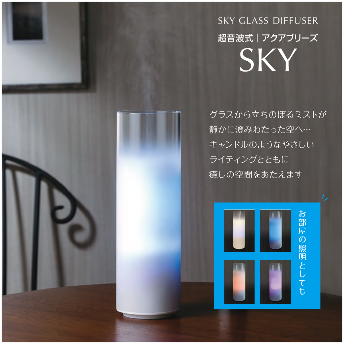 グラスから立ち上るミストが拡散。キャンドルのようなライティングで、癒しの空間を与えます。ペットボトルやカップなどで水タンクに水を注ぎ、好みの精油を5~6滴入れるだけ。※天然精油は別売りです。● 特長・2H・4H・8H(5分間隔間欠運転)・3色自動変化→ブルー→オレンジ→パープル→消灯付き・お掃除・お手入れ簡単~認知症予防の効果にも期待~認知症の中でも最も多いのが、記憶力や思考力が衰えていく「アルツハイマー型認知症」。その前兆は「嗅覚」の障害から現れます。そのことから、物忘れの症状が始まる前から【嗅覚に刺激を与える】ことで、認知症を予防、記憶力の活性化を増やす可能性があると言われています。■ 商品名:アクアブリーズ SKYスカイ■ サイズ:80×250×50mm■ 材料/PP、ガラス■ 重さ/約703g■ 使用水/常温の水道水またはミネラルウォーター ■ 電源/DC24V 500mA (専用アダプター付き) ■ 電力/12W ■ 水タンク容量/115ml ■ 芳香範囲/45m2(約20畳)●使用場所リビング、寝室、パウダー ルーム、オフィス、応接室、会議室、ホテル、 美容室etc...*この商品は注文確定後7日以内で発送いたします。