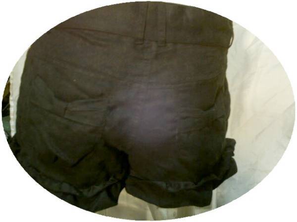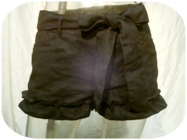 ウエストブラック1ボタン・ファスナー付きで左右ポケット付きでウエストリボン付きで結んで履いていただけて裾フリルでとてもカワイイです。バック左右リボンポケット付きでキュート!やわらかなスエード調の素材で肌触り良く履いていただけます。★未使用で自宅保管ありです。春・秋向き お色:ブラック 生地:ポリエステル100% サイズ:M ウエスト61 ヒップ87 股下6.5 股上23