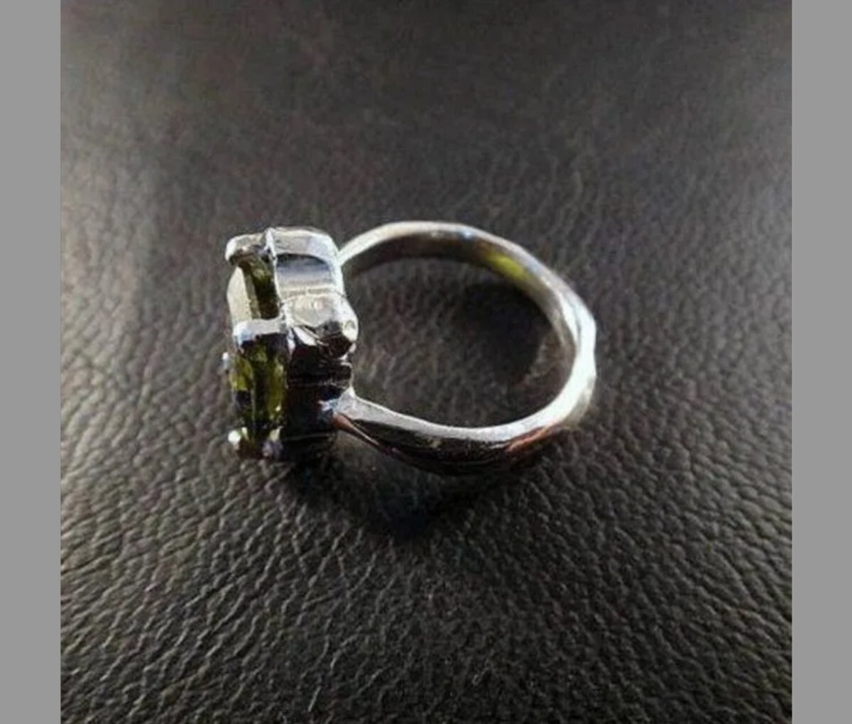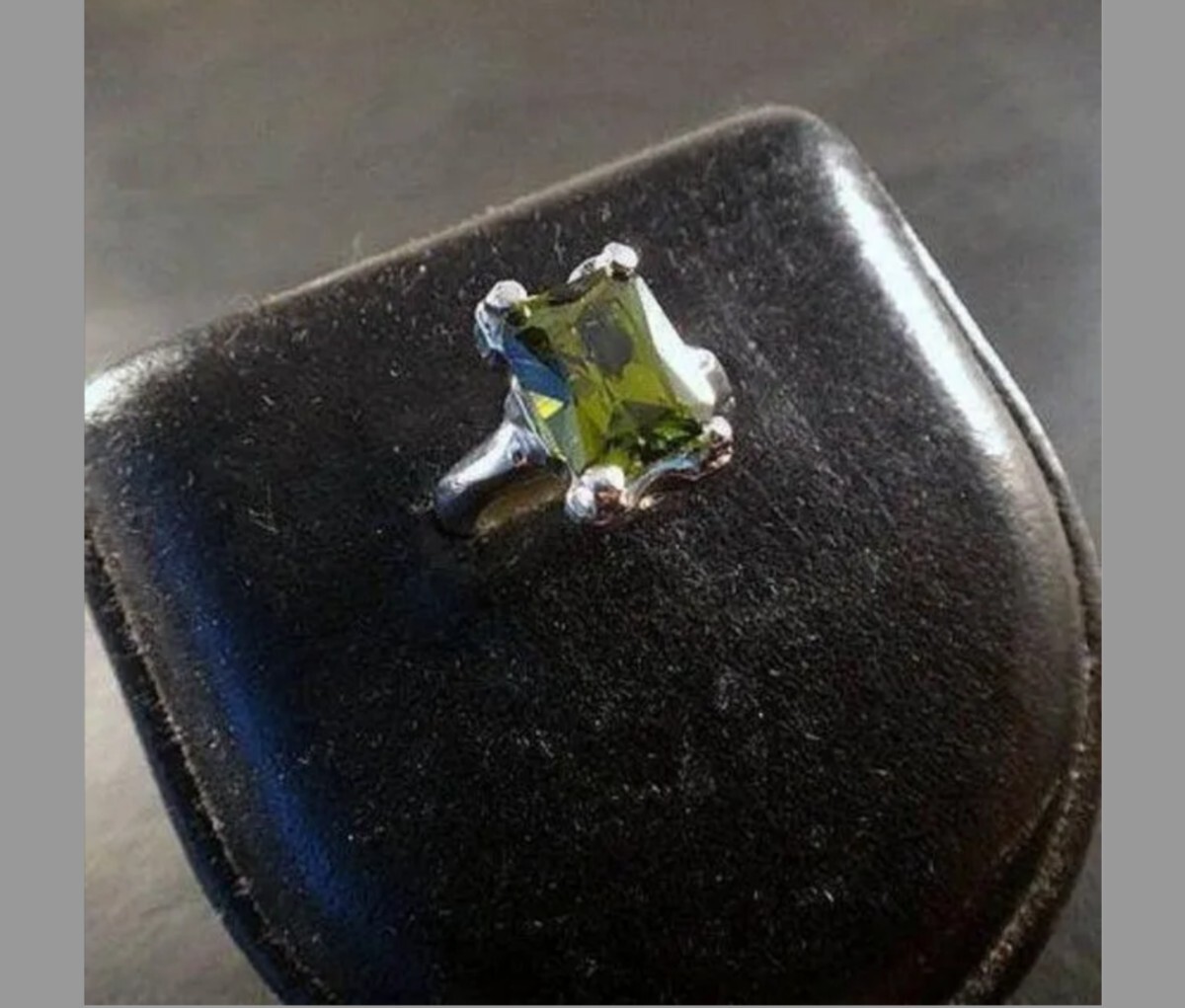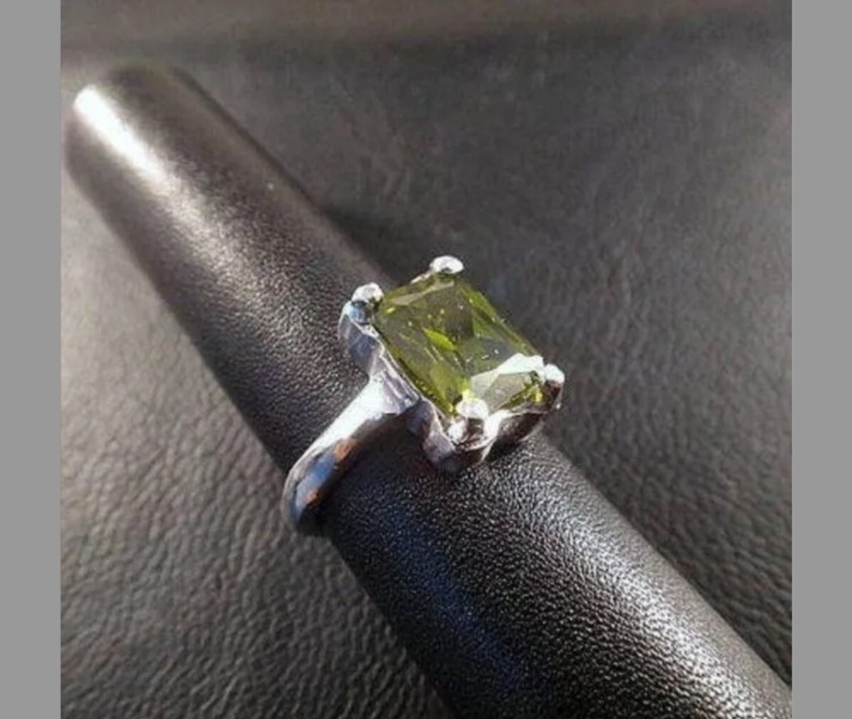 エメラルドカットのオリーブグリーンCZ”キュービックジルコニア”(10㎜×8㎜)を4本の爪で留めたリングです。