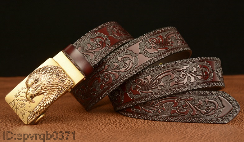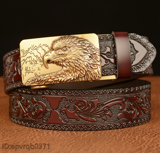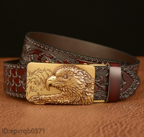 新品 レザーベルト オートロック式 バックル イーグル メンズベルト 本革 幅3.5センチ 柄物 長さ調整可能 /茶色