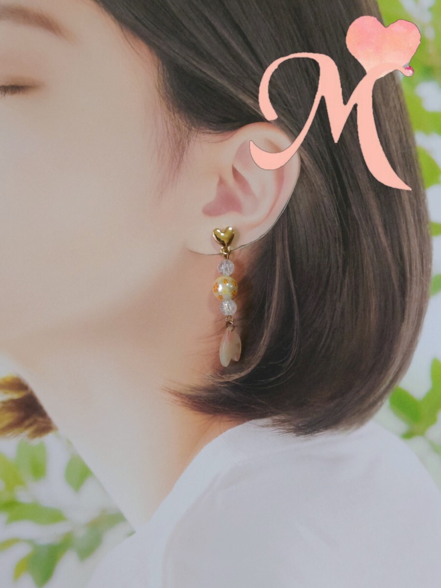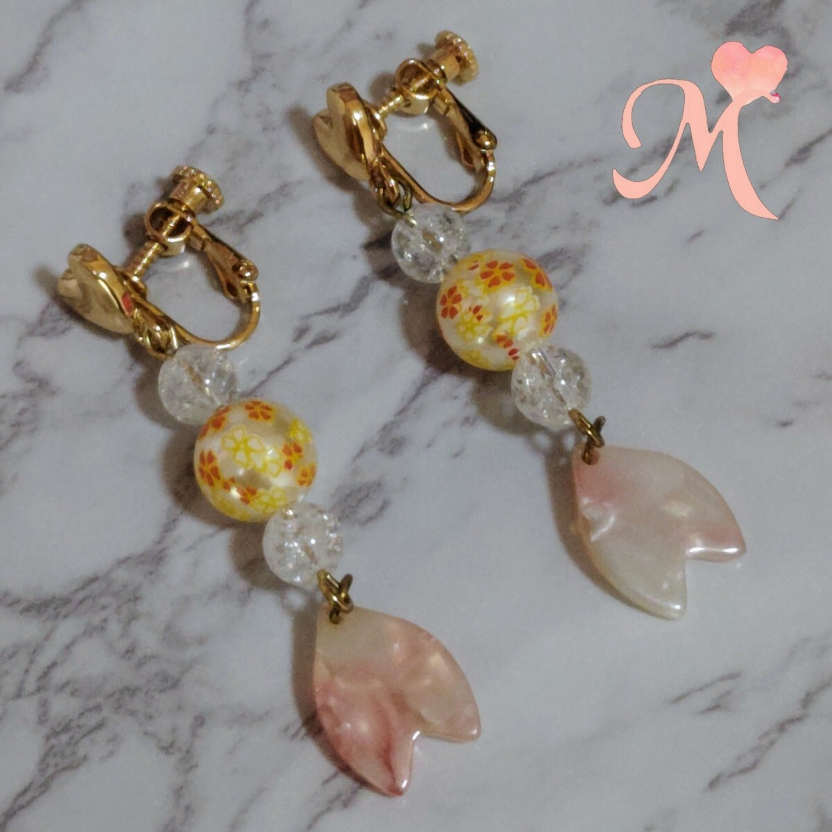 ハンドメイド アレルギー対応 イヤリング or チタン ピアス ハート 桜プリントビーズ 水晶 花びら