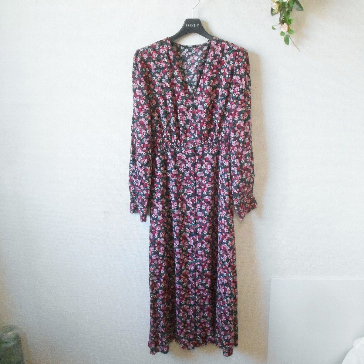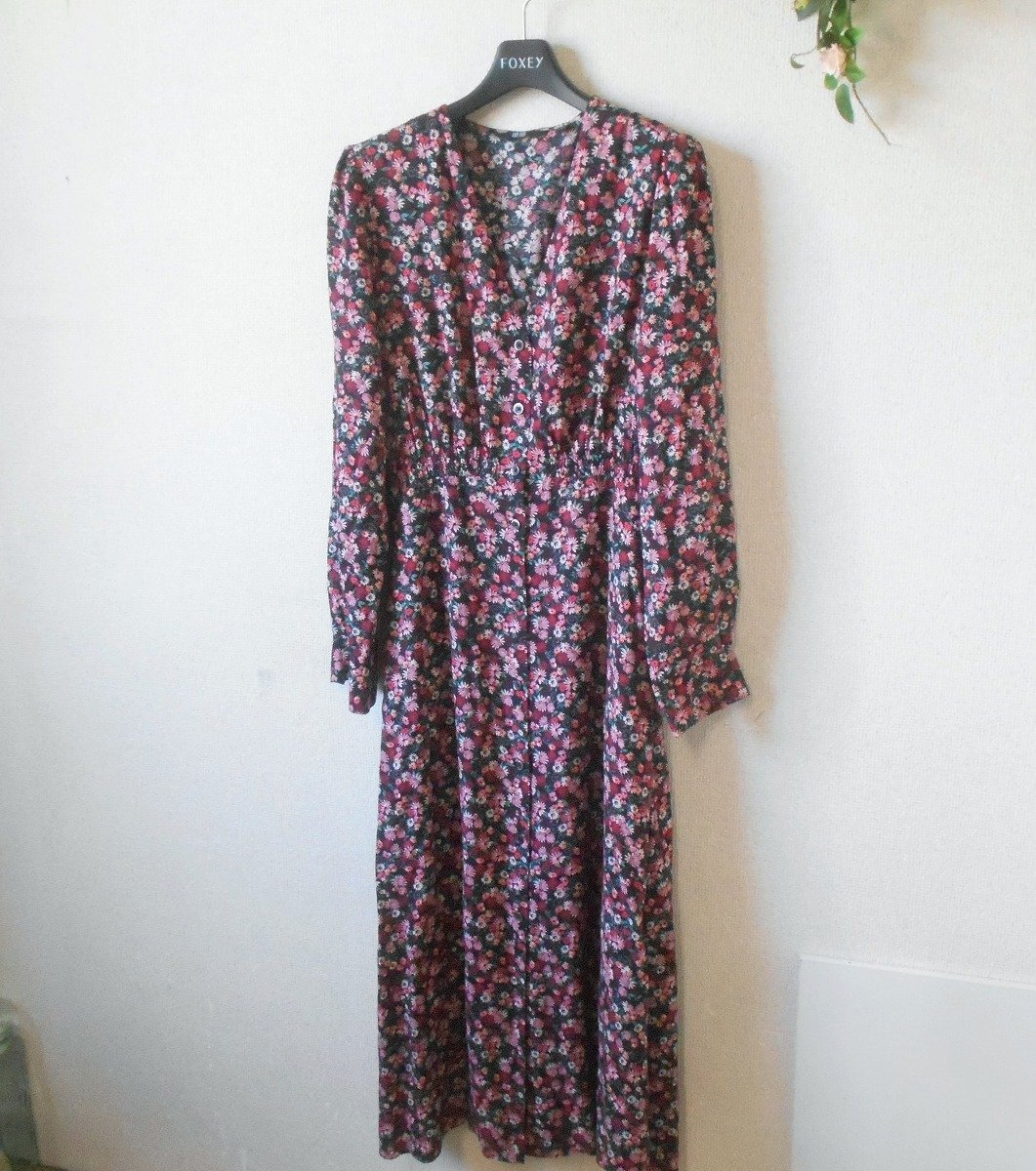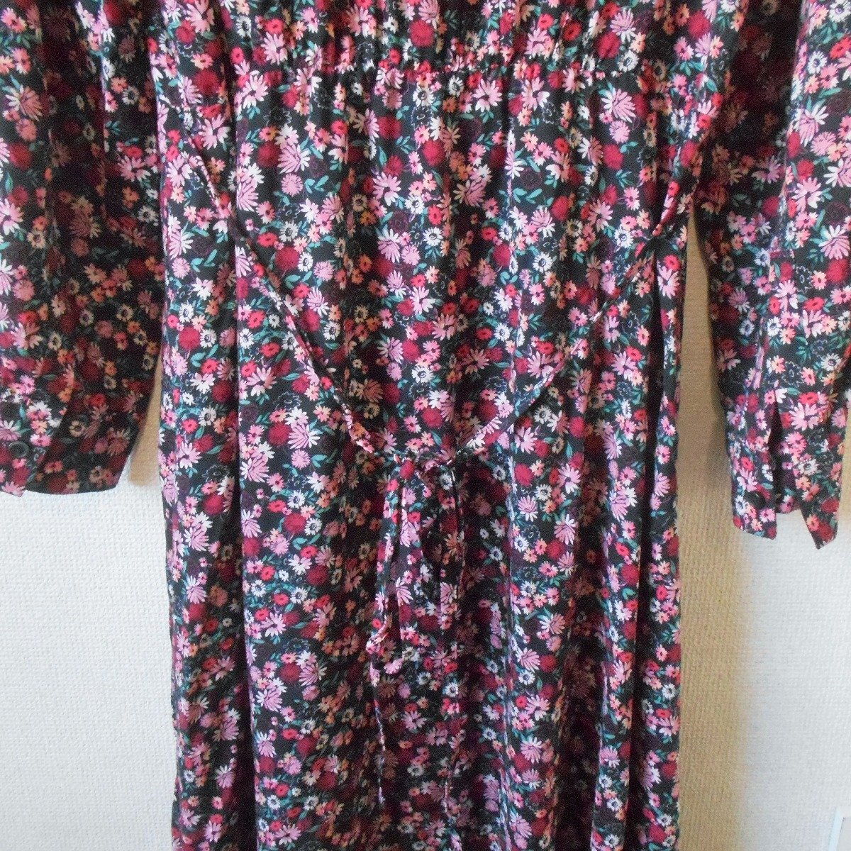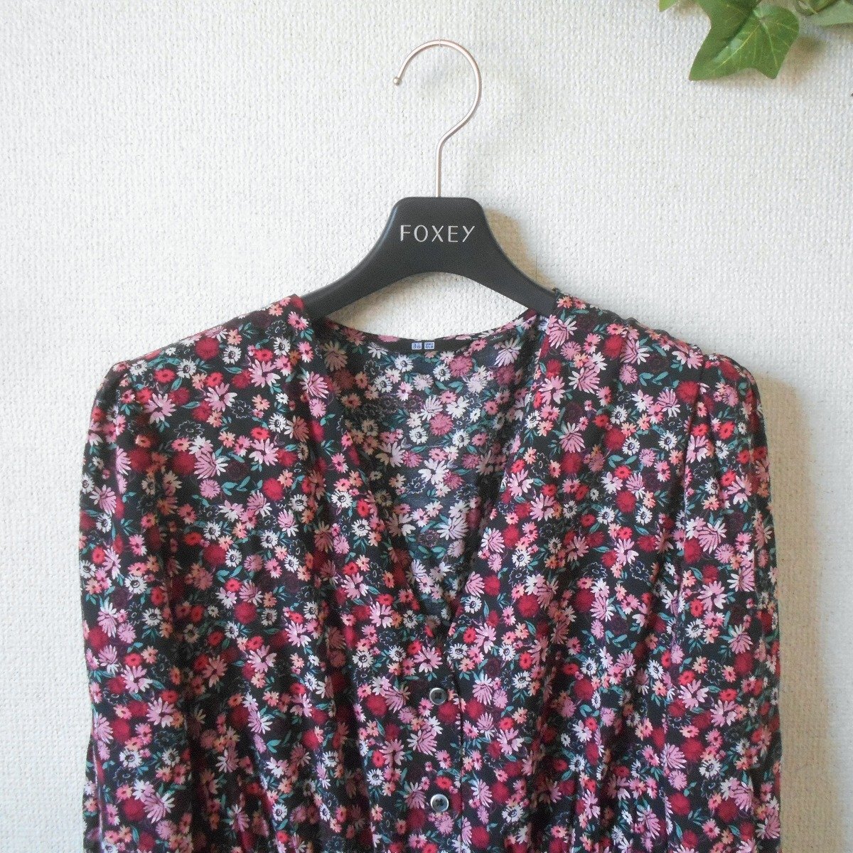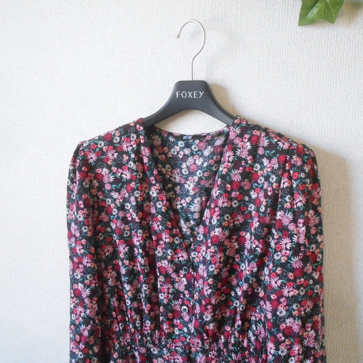 【ポイント】ユニクロのワンピースになります。お色は黒色ベースで赤やピンク等の小花のプリントが全体に入っています。