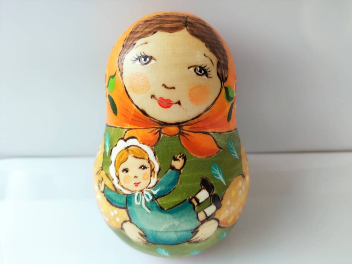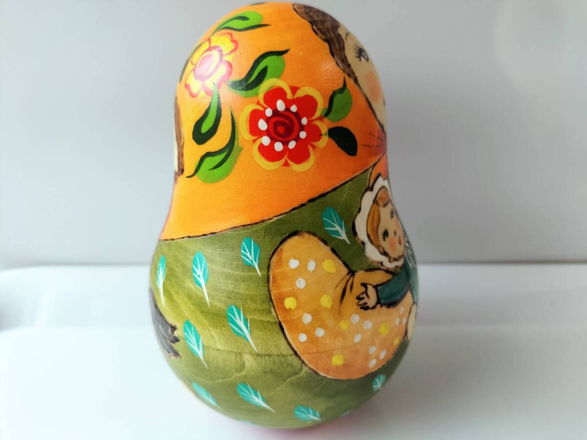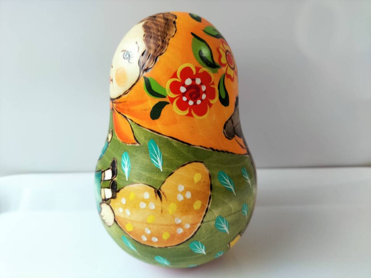 ロシア最北のアルハンゲリスク州の都市群に伝わる北方民族の伝統工芸品「メゼーニ塗り」を制作している職人夫婦によるハンドメイドのマトリョーシカです。カランコロンと音が鳴ります。