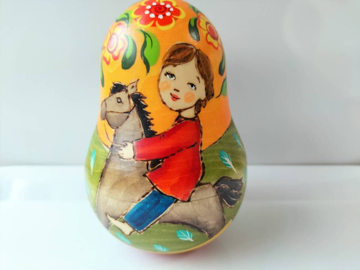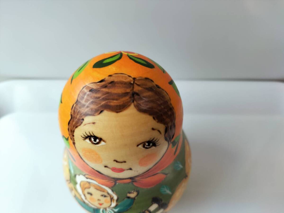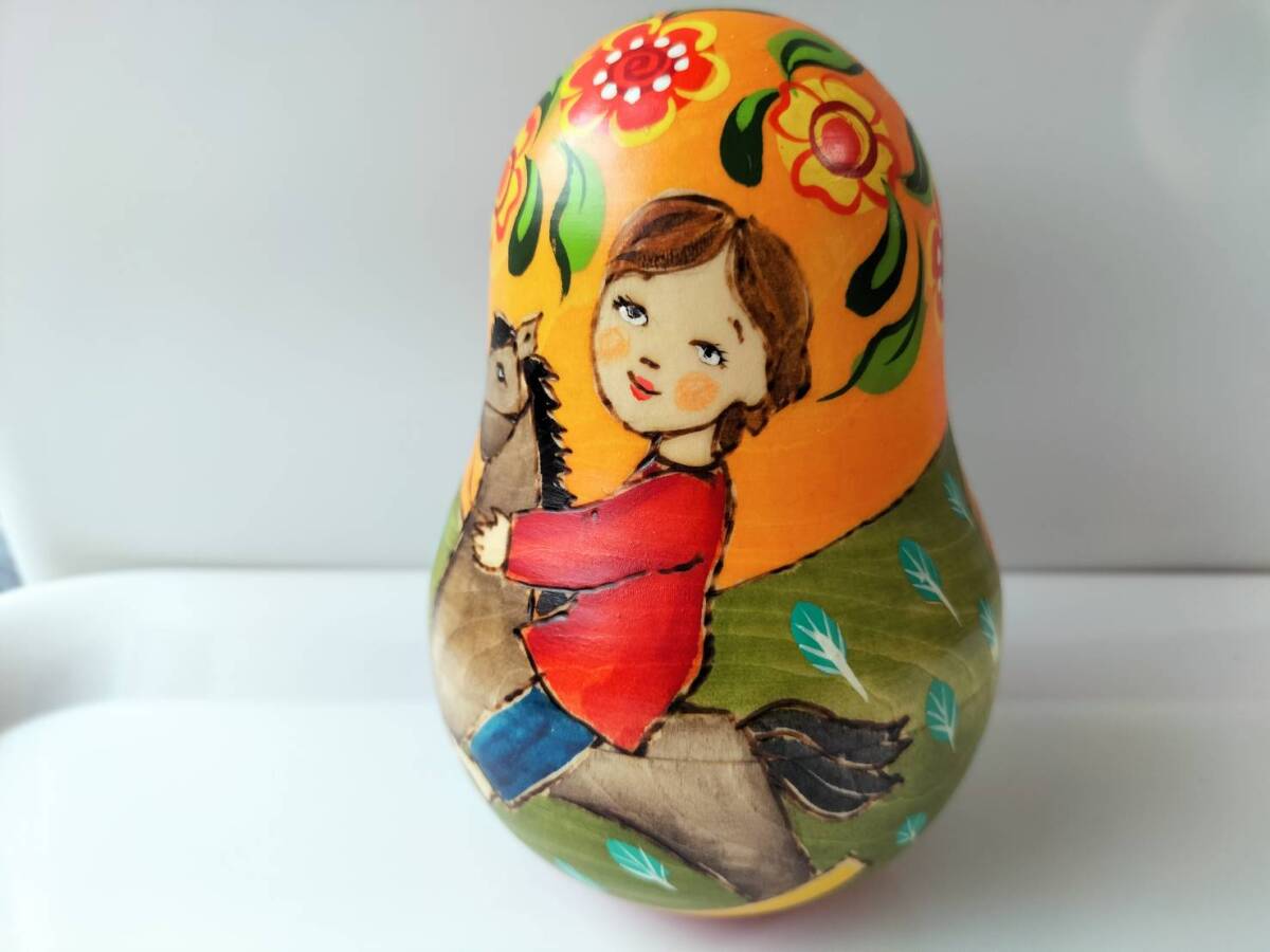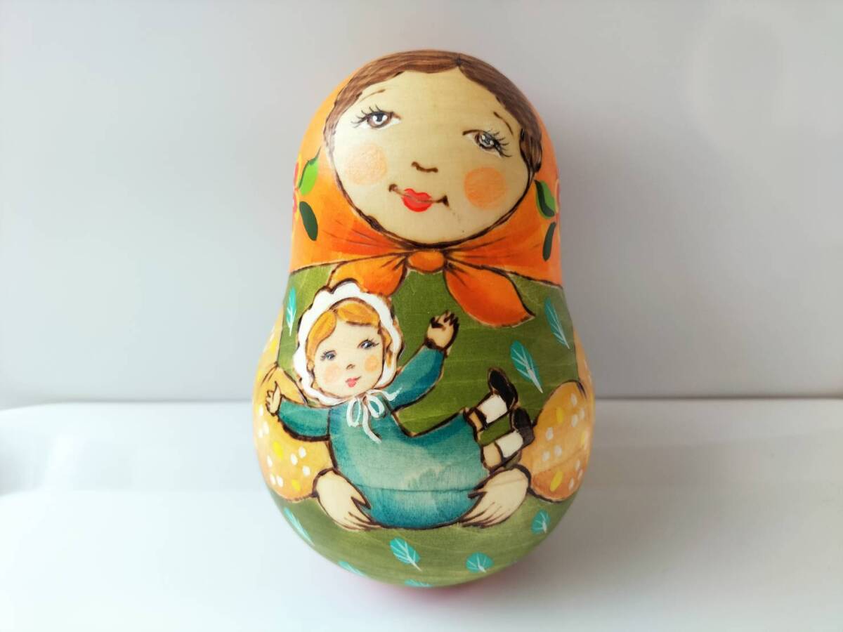 ロシア最北のアルハンゲリスク州の都市群に伝わる北方民族の伝統工芸品「メゼーニ塗り」を制作している職人夫婦によるハンドメイドのマトリョーシカです。カランコロンと音が鳴ります。