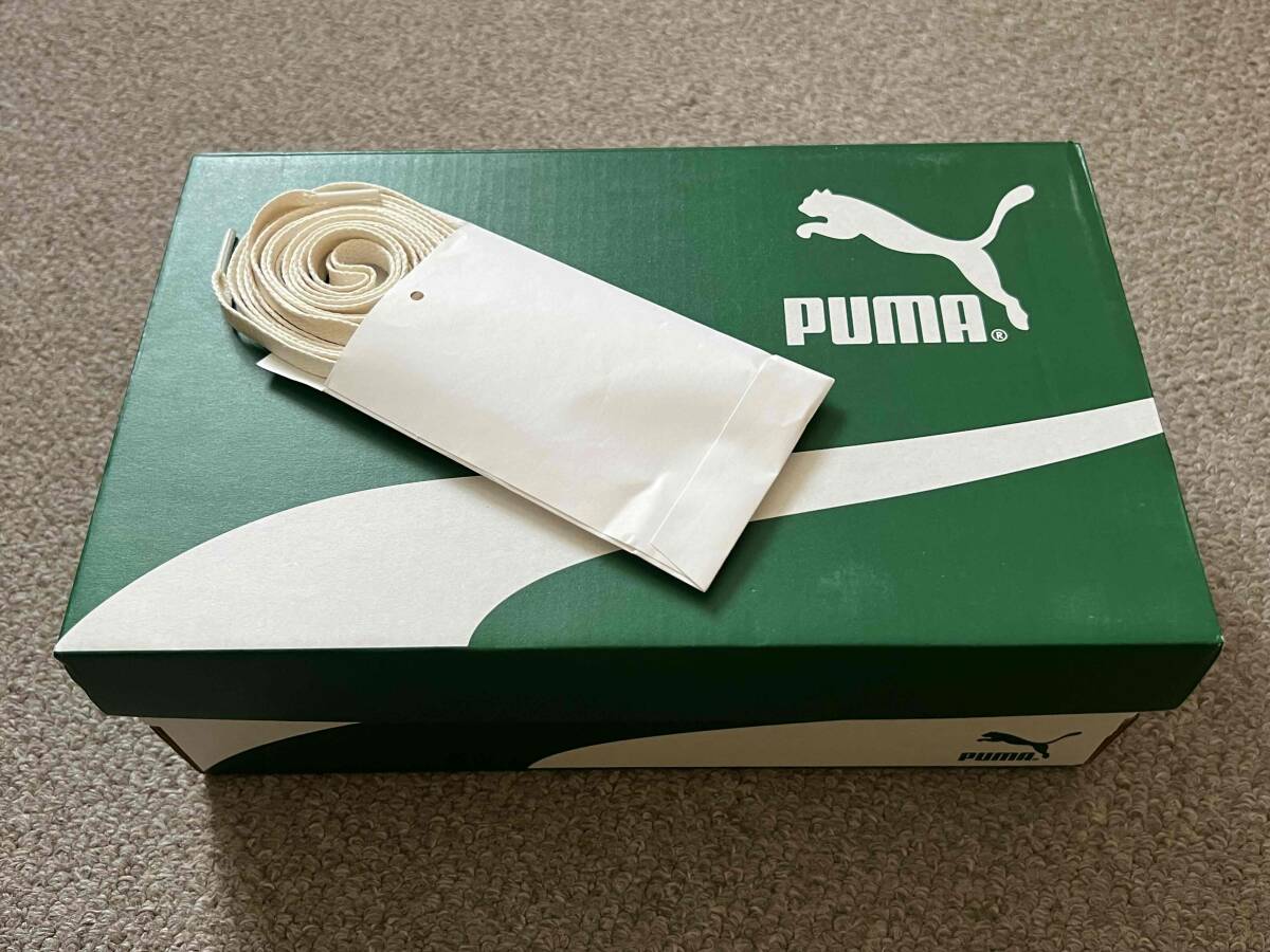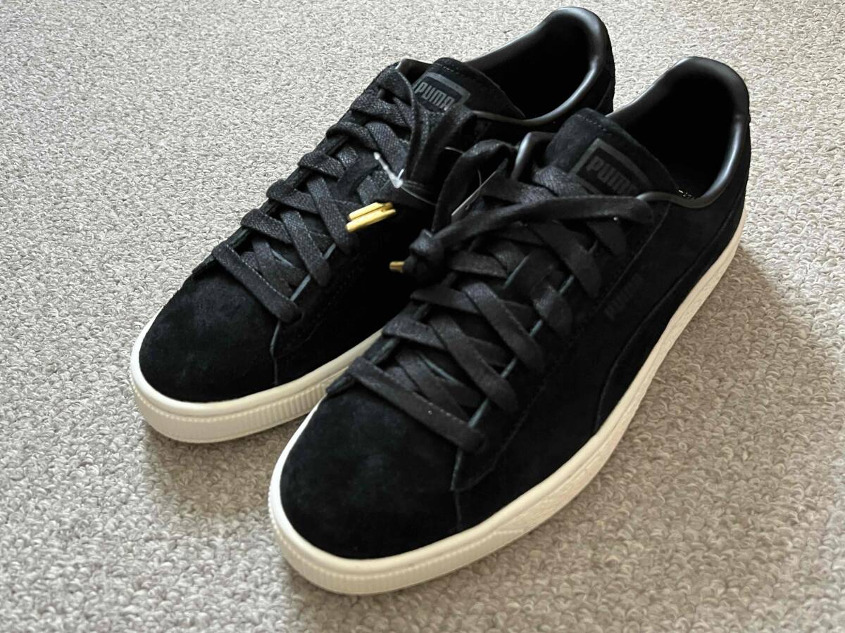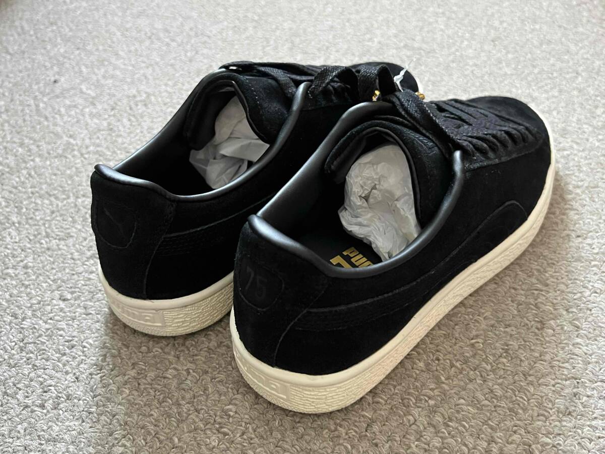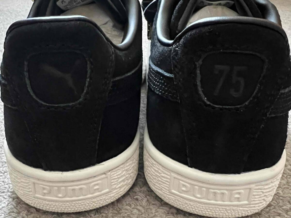 ブラック1色でまとめたスウェードのアッパー、ヒールマークは左右それぞれにプーマキャットと75、インソールにはゴールドで「PUMA 75」のプリント、など当モデルだけの特別な仕様となっています。