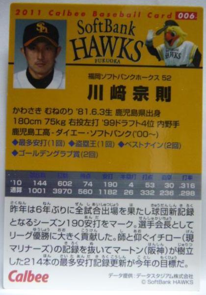 カルビープロ野球カード2011年#006【川崎 宗則(福岡ソフトバンク ホークス)】平成23年チップスおまけ食玩トレーディングカード(中古)送料込