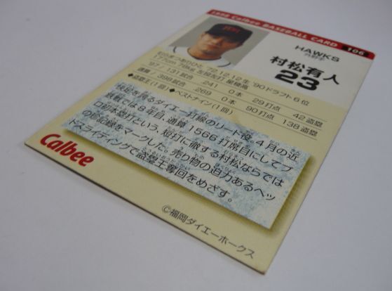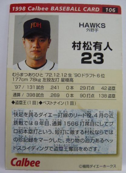 カルビープロ野球カード98年#106【村松 有人(福岡ダイエー ホークス)】平成10年1998年チップスおまけ食玩トレーディングカード【中古】
