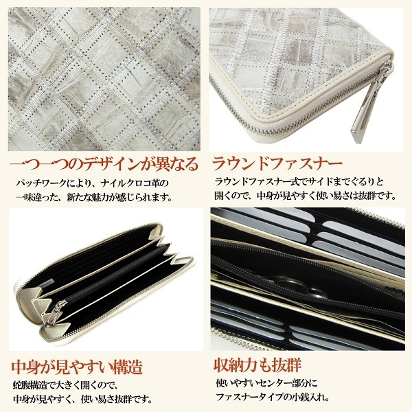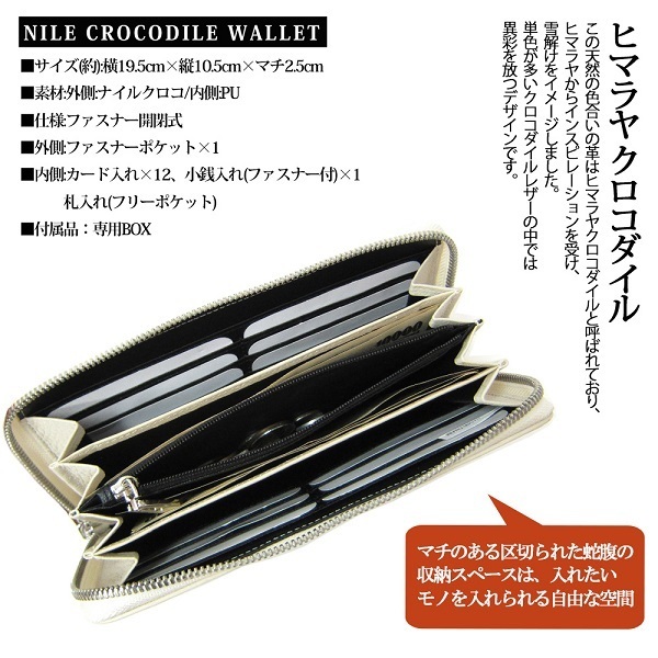 | ワニ革の中でも最高級の、「革のダイヤモンド」とも称される、ナイルクロコの革を使った贅沢な長財布。 パッチワークにより、ナイルクロコ革の一味違った、新たな魅力が感じられます。 この天然の色合いの革はヒマラヤクロコダイルと呼ばれており、 ヒマラヤからインスピレーションを受け、雪解けをイメージしました。 単色が多いクロコダイルレザーの中では異彩を放つデザインです。 見た目だけでなく、収納力も抜群。 多くなりがちなカード類やチケット、レシートなどをしっかり仕分けでき、機能性の高い作りになっています。 男女問わずお使い頂けます。 是非、こだわりの使い易さを体験して頂きたい。 ■カラー:外側 ヒマラヤグレー、内側 ブラック ■サイズ(約):横19.5cm×縦10.5cm×マチ2.5cm (実物の為、多少の誤差が生じますことはご容赦下さい。) ■素材:外側 ナイルクロコ(KKLK社ナイルクロコ革)/内側 PU ■仕様:ファスナー開閉式 ■内側:カード入れ×12、小銭入れ(ファスナー付き)×1、札入れ(フリーポケット)×6 ■付属品:専用BOX 〇当店の製品に使用されている全ての皮革は、野生生物保護のもとで飼育され「ワシントン条約“CITES/サイテス”」により適法に輸入されたものです。 【入札前の注意事項】-必ずご確認の上、入札下さいませ- ・天然素材のナイルクロコを使用しておりますので、1点1点同じ柄は御座いません。 (画像は代表的な班(柄)となります。柄でのお取替えは出来ませんので予めご了承ください。) ・ご使用のコンピュータの環境や撮影の光加減によって実際の商品のイメージと多少異なることが御座います。 ・入荷時期によって若干仕様が変更される場合が御座います。 (例:ファスナー金具の色、カードポケットの位置、札入れ(フリーポケット)の数等) ※出品画像と異なる場合が御座います。 ご不安な場合は事前に質問等でご解決して頂きました上で落札お願い致します。 以上ご理解とご了承の上、入札、落札をお願いします。 | |
