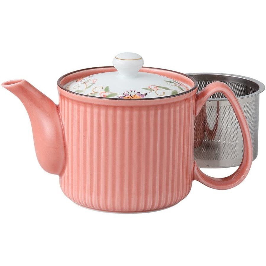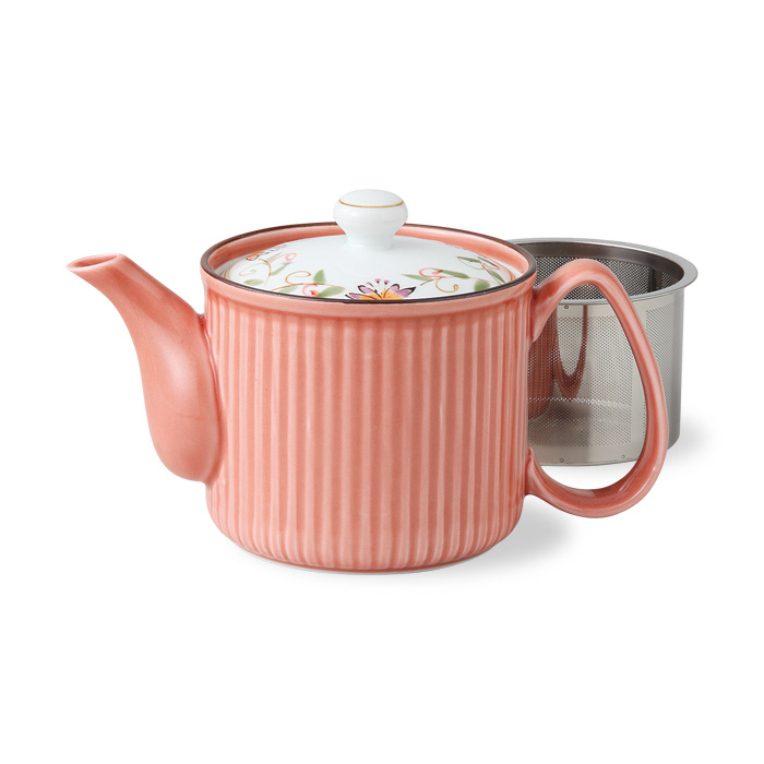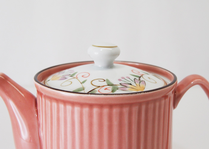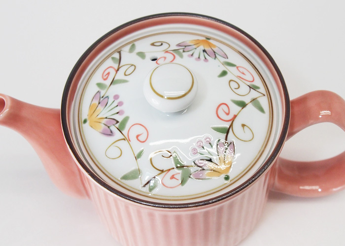 【刻まれた溝で釉薬の濃淡が楽しめる蓋に花が手描きされた赤色の軽量ポット】