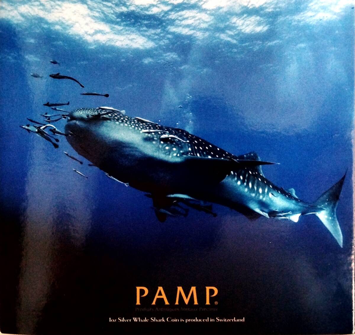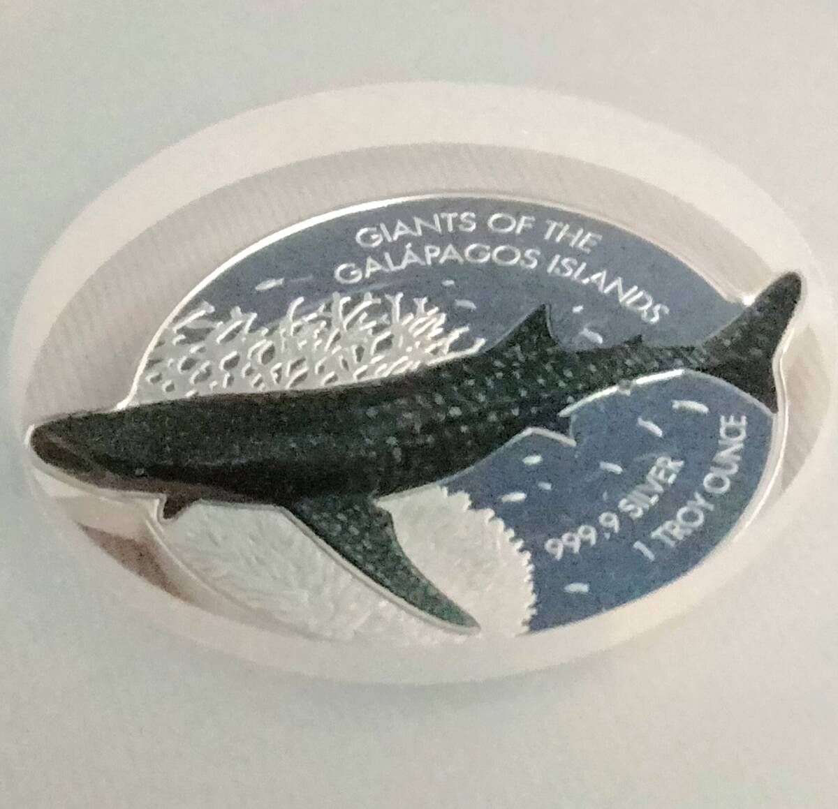 銀貨には、珊瑚礁の上に漂う巨大なジンベエザメが描かれています。