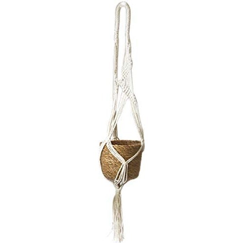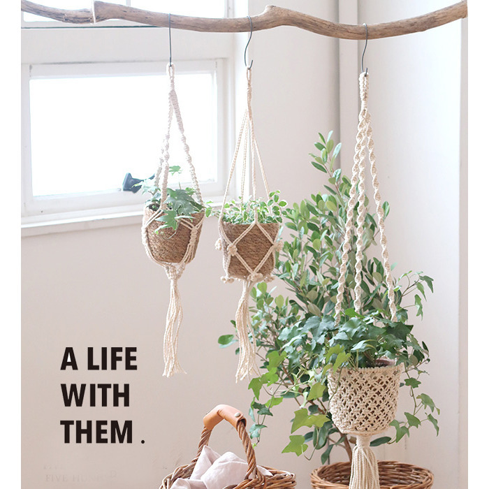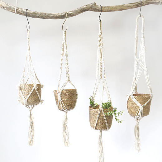コットンロープを伝統的なマクラメ編で編み上げたプラントハンガーと天然素材シーグラスのポットをセットしました。柔らかな素材感と細かな装飾がマッチしたハンギンググッズです。
