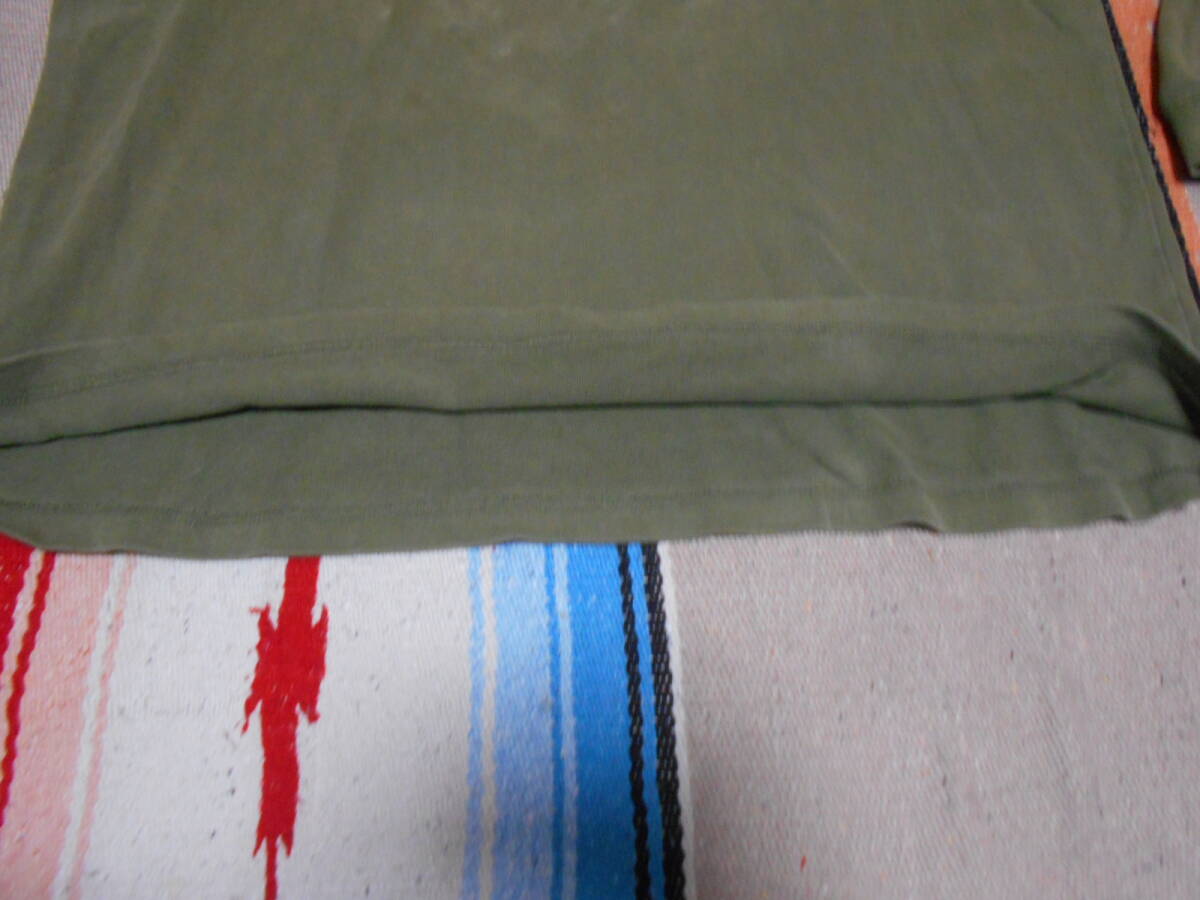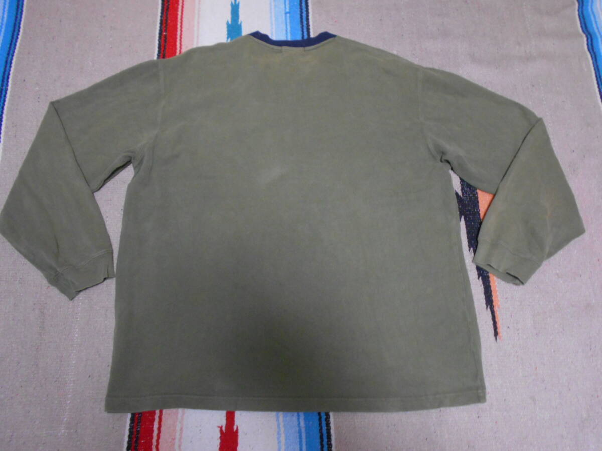 スウェットとロンスリTの中間のような厚みの有るコットン100%素材、動き易いルーズフィットのシルエットと絶妙なネックのカット、風合いある発色の オリーブ × ネイビー のカラーマッチがとても良いテイスト