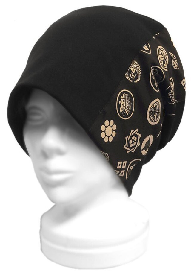 ◇送料無料◇ ハンドメイド◆和柄[戦国武将/家紋柄]ルーズワッチキャップ◆コットンニット/黒 ◇ゆったり・小顔効果・オールシーズン着用