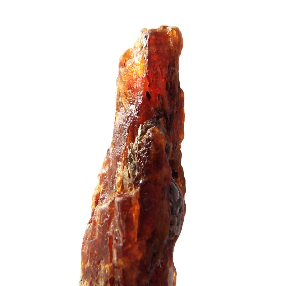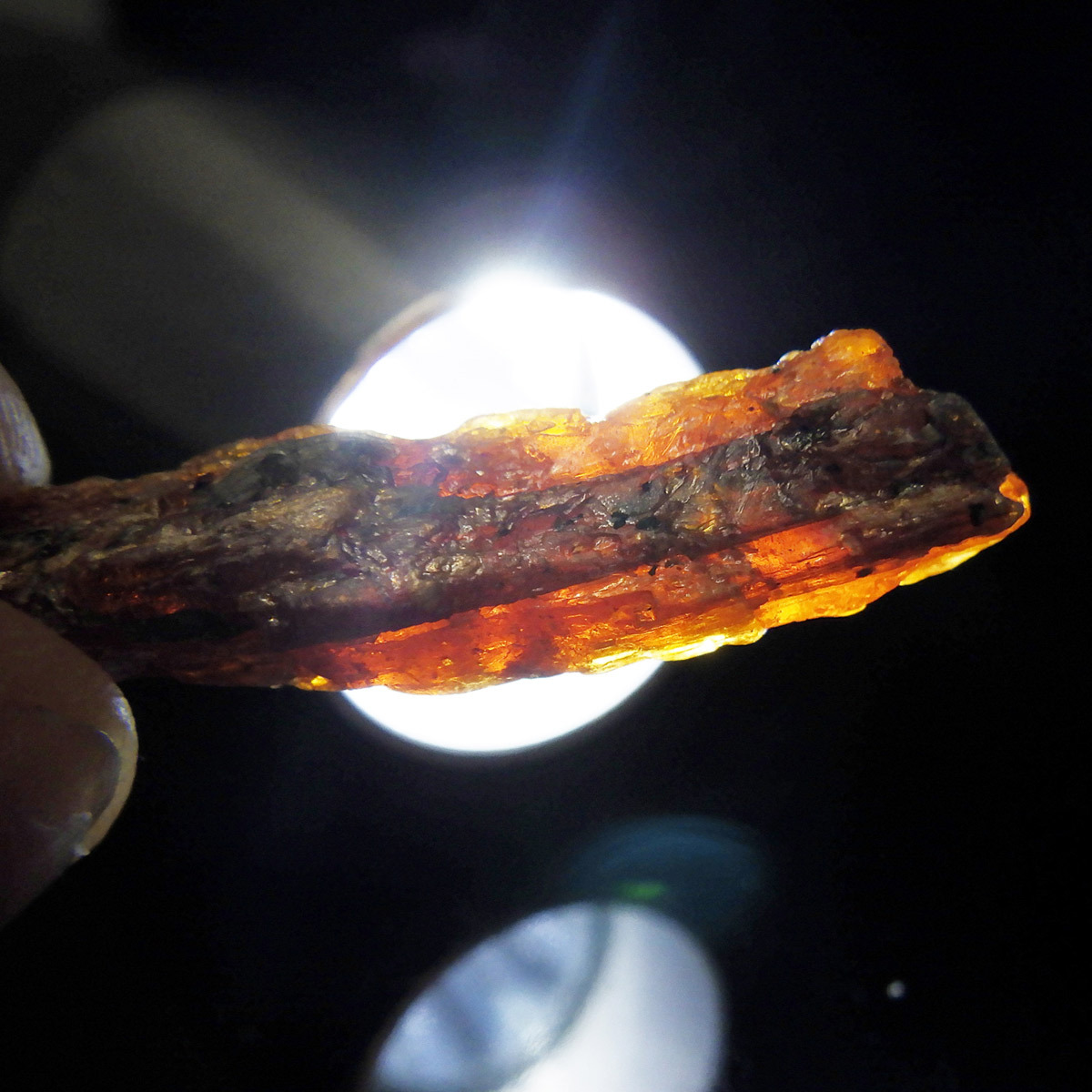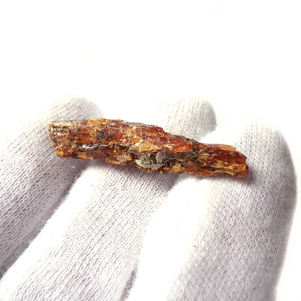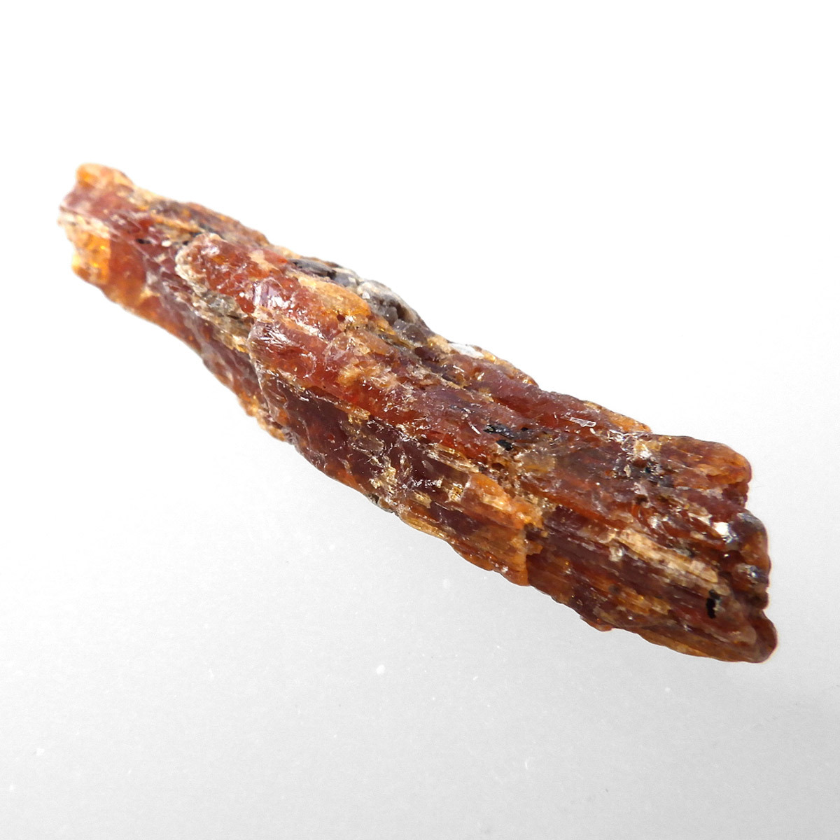 タンザニア産、オレンジカイヤナイト結晶原石です。カイヤナイトといえば、ブルーがよく知られており、他にはグリーンがたまに見かける程度でした。オレンジカイヤナイトは2007年にタンザニアで発見され 、2009年のツーソンショーで初めて現れ注目されたレア宝石です。鋭く縦に伸びる結晶と表面の光沢は、ブルー同様カイヤナイトの特徴としてオレンジカイヤナイトでも見られます。光も透過し、美しい姿を見せてくれます。