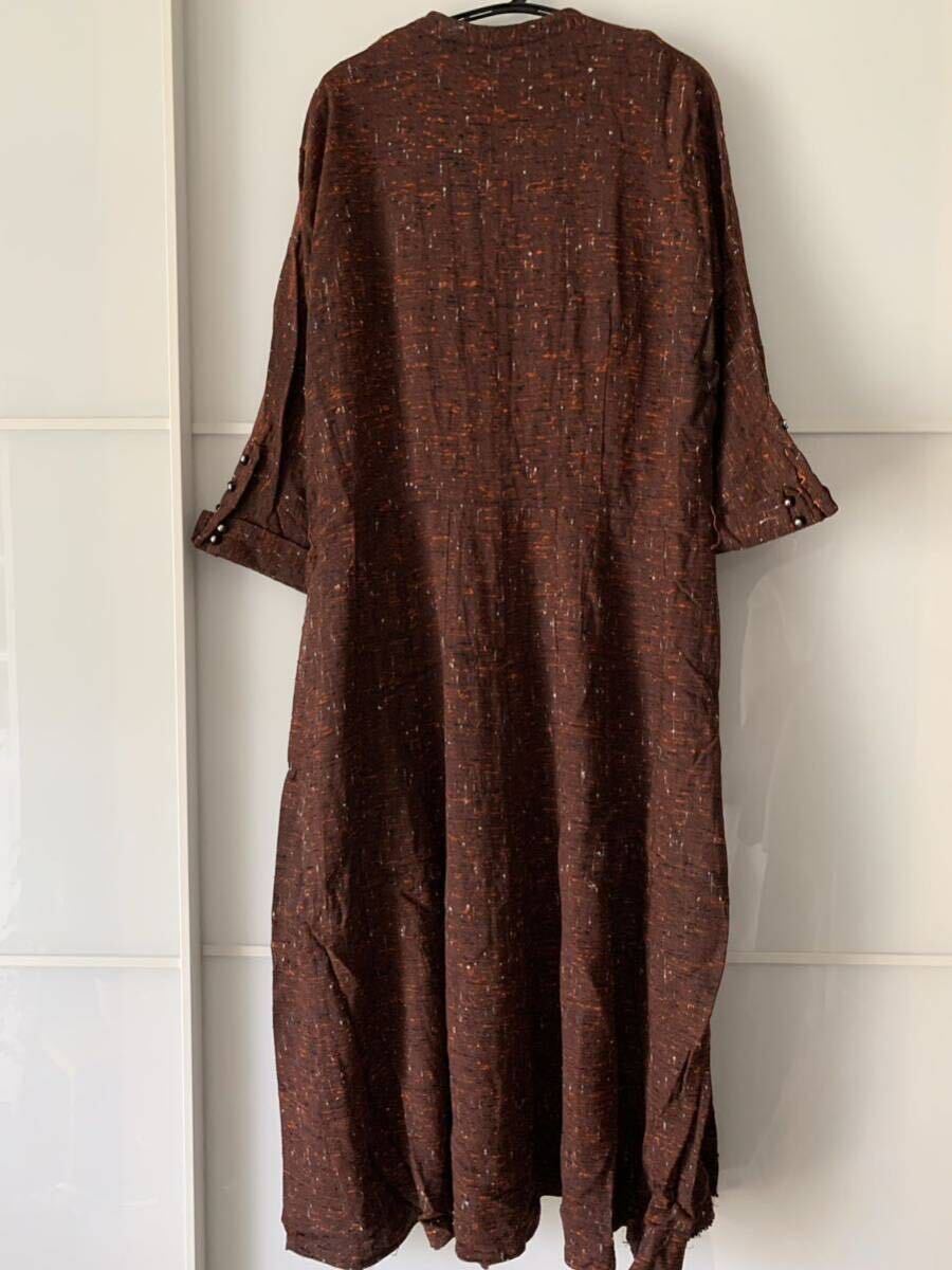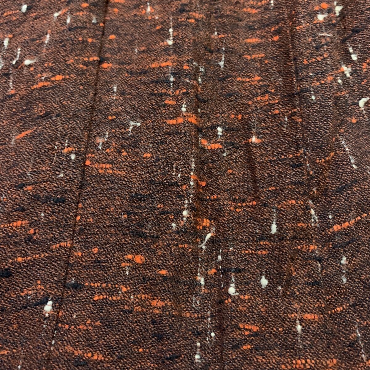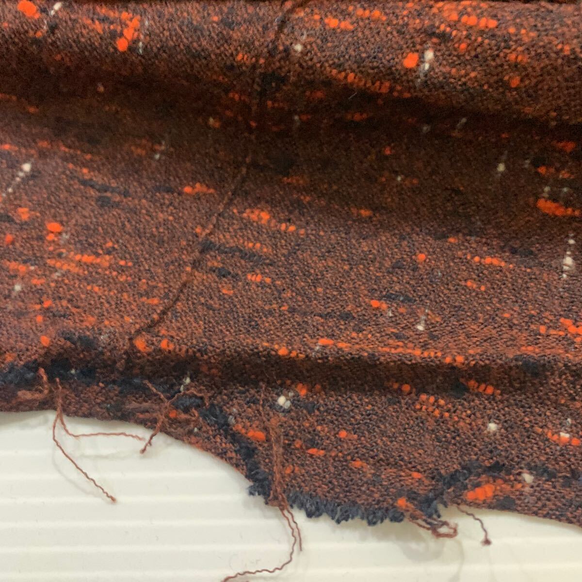 生地の一部(写真7)。茶色地に白黒オレンジの織りになっています。レーヨンとコットンの混紡ではないかと思います。違っていたらすみません。