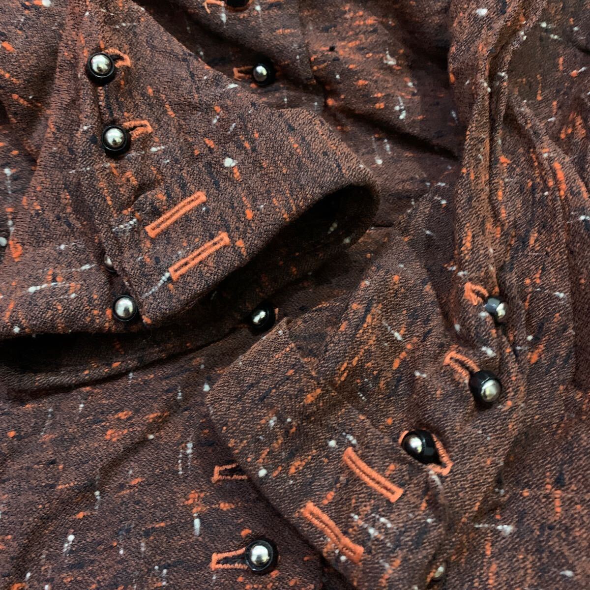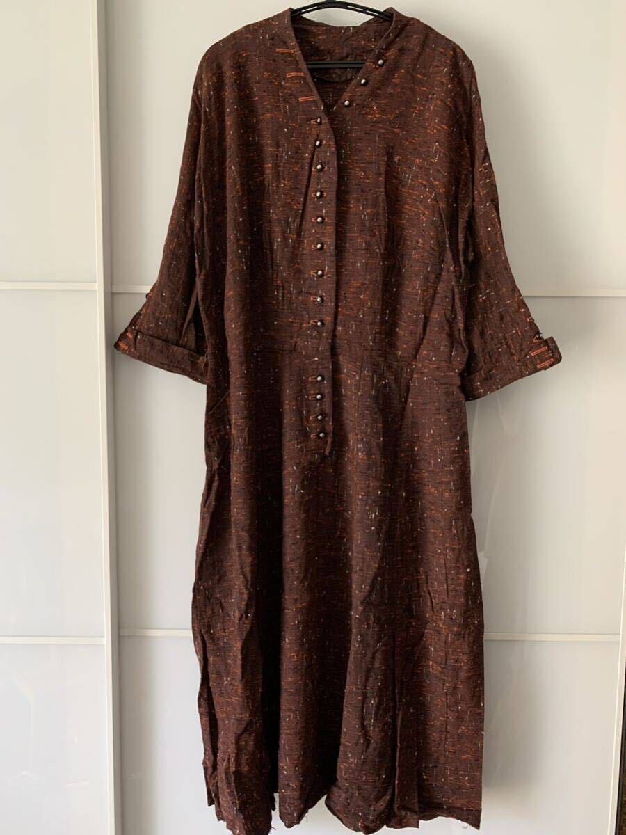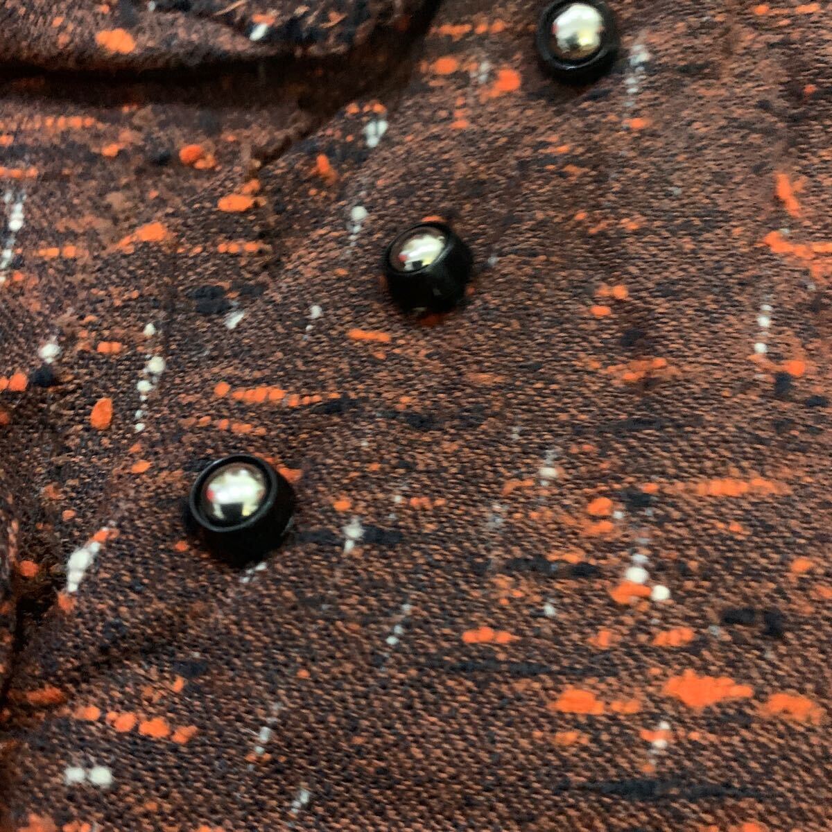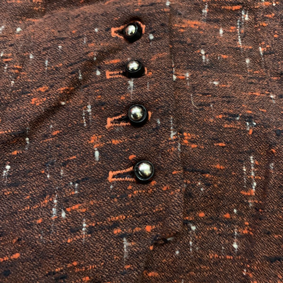 生地の一部(写真7)。茶色地に白黒オレンジの織りになっています。レーヨンとコットンの混紡ではないかと思います。違っていたらすみません。