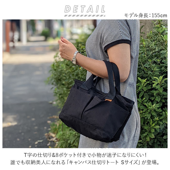 商品説明 | ・・T字の仕切り&8ポケット付きで小物が迷子になりにくい!誰でも収納美人になれる「キャンバス仕切りトート Sサイズ」が登場。 ・コンパクトな見た目ながら、お出かけに必要な小物がすっきり収まる♪デイリー使いにぴったりなトートバッグ。 ・通気性と強度のバランスが抜群!しっかりとした厚手のキャンバス素材を使用。ナチュラルな素材感も魅力♪ ・収納スペースは3つのスペースに仕切られており、小物の整理整頓がラクチン◎ ・大スペースはA5サイズのノートや長財布が横向きにすっぽりと収まるサイズ感。オープンポケット×2付き。 ・中スペースには、ミニポーチや小さめのランチボックスなどをIN。オープンポケット×1付き。 ・小ポケットはペットボトルをすっぽりと収納可能。(※500mlのペットボトルを入れた場合、上部がバッグから少し飛び出るサイズ感です。) ・吊りポケットは面ファスナー式のフタに変身!(※収納スペースの中央部分のみを隠せる仕様です。) ・取り外し可能な底板付きで、荷物を安定した状態で持ち運びOK。しっかりと自立するのもポイント。(※仕切りは底面に縫い付けされていない設計なので、3つの収納スペース全てに底板が収まる形になります。) ・前面・背面に合計4つのオープンポケット付きで、スマホなどサッと取り出したい小物の収納に便利! ・フロントのロゴタグがアクセント。 ・豊富なカラーバリエーションから、お気に入りを選んで♪ |