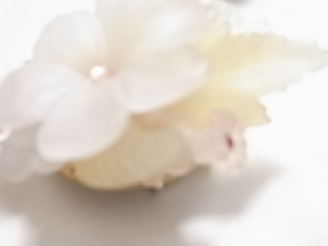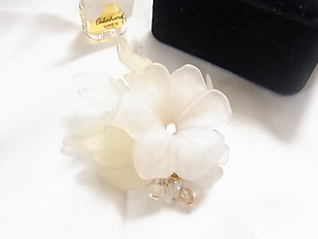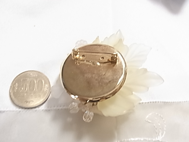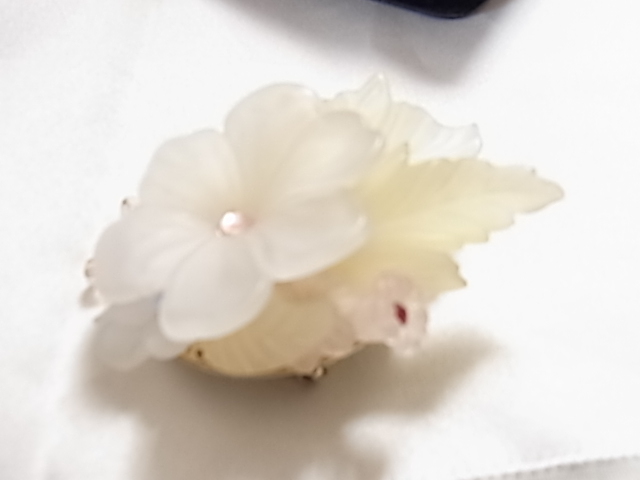 大き目 インパクト 氷砂糖のような色味 お花デザイン フラワーモチーフ 葉っぱ リーフ 桜色の小花と3粒のビーズ付き ブローチ◎