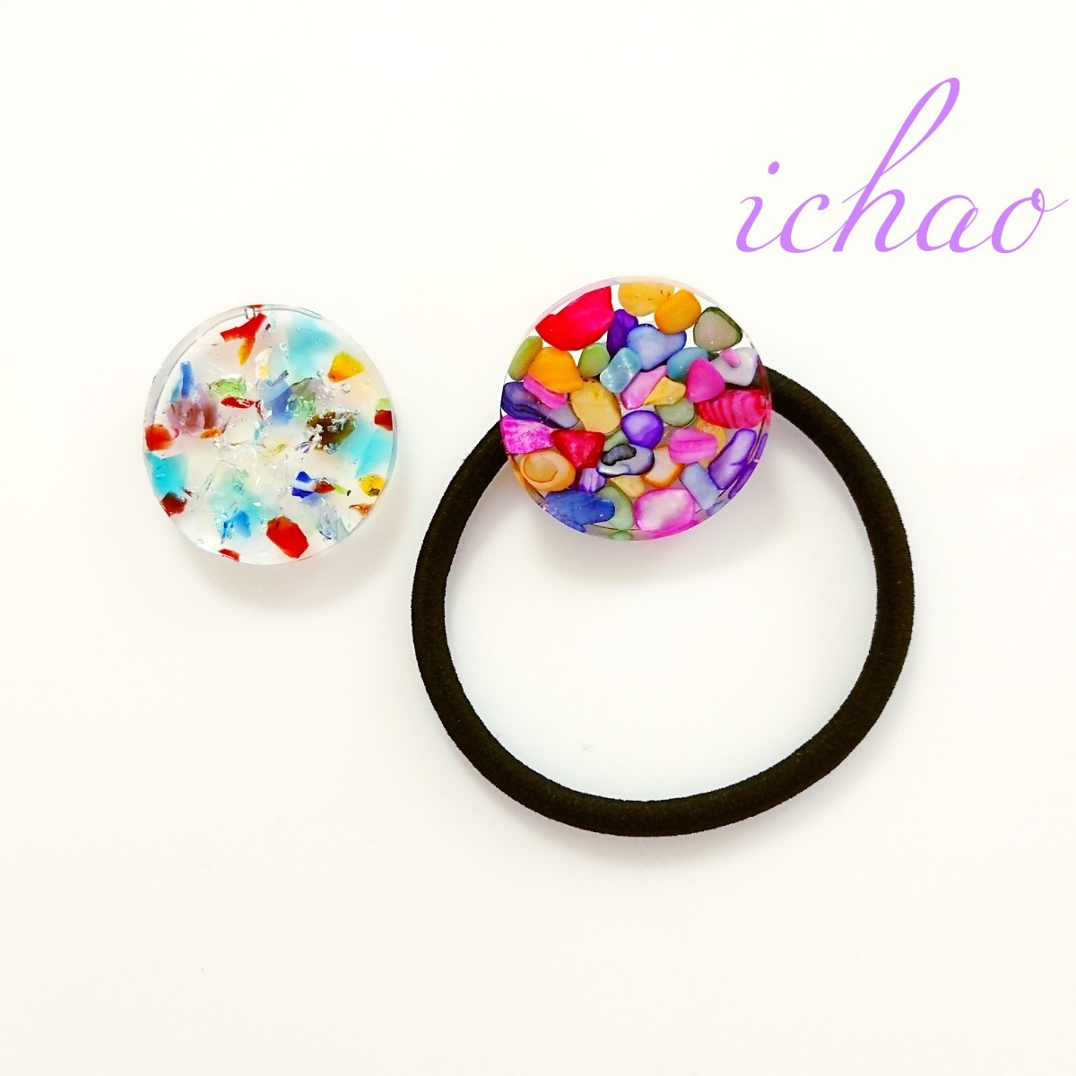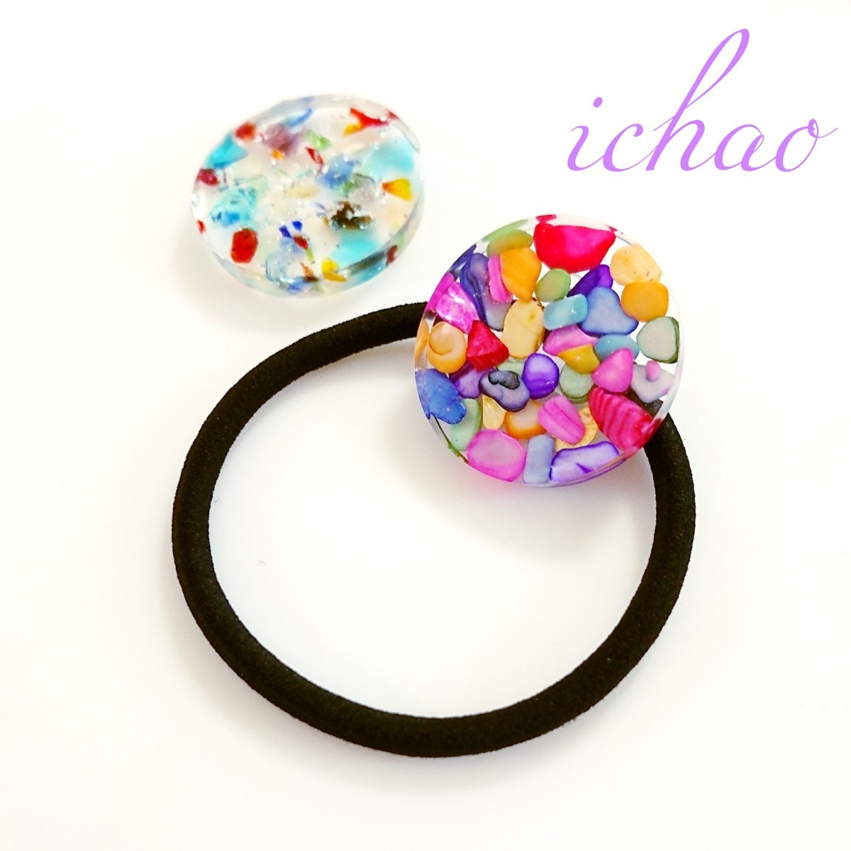 カラフルシェルorカラフル琉球ガラスをレジンで閉じ込めたとっても可愛いヘアゴムです(^^)