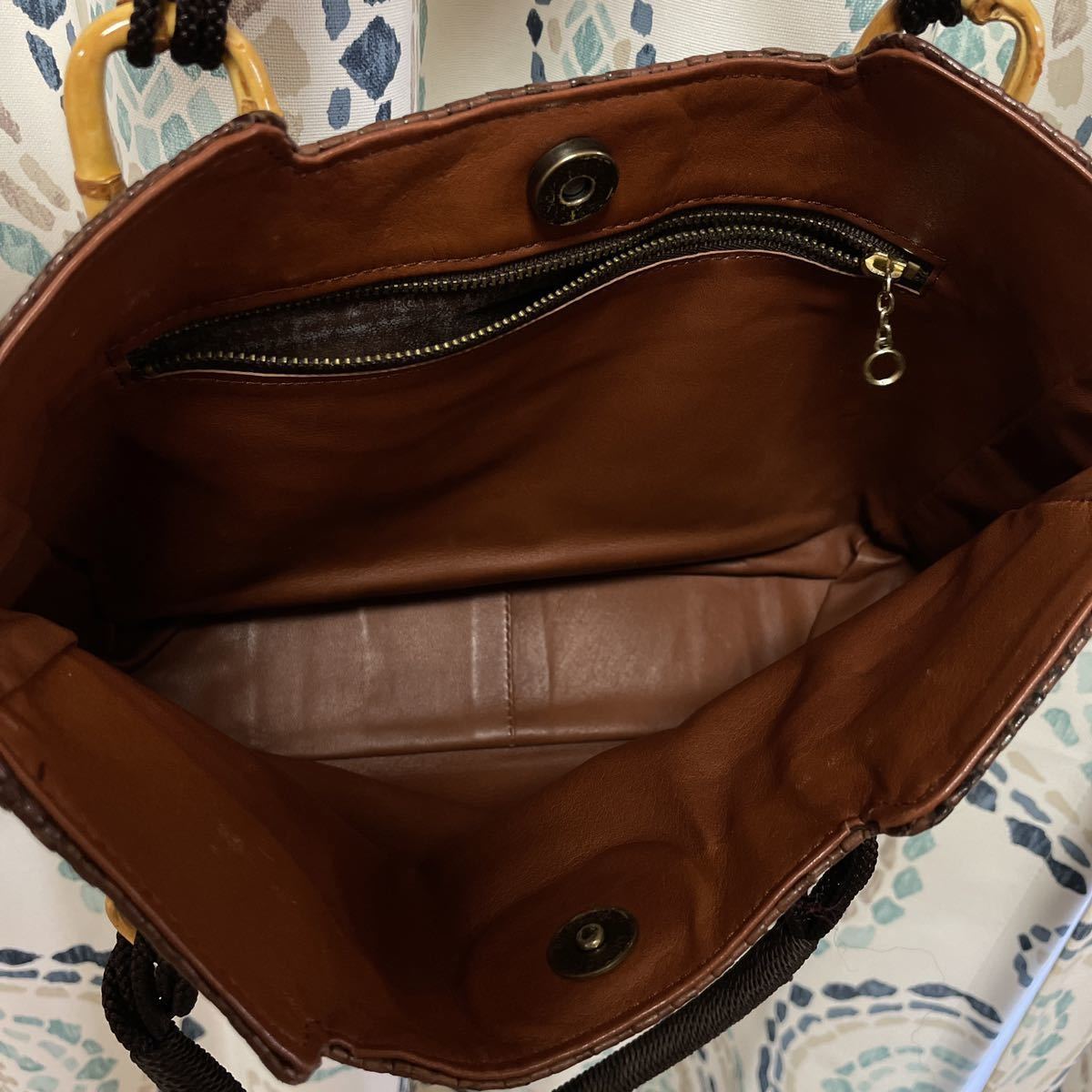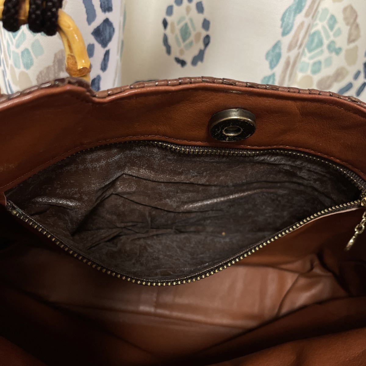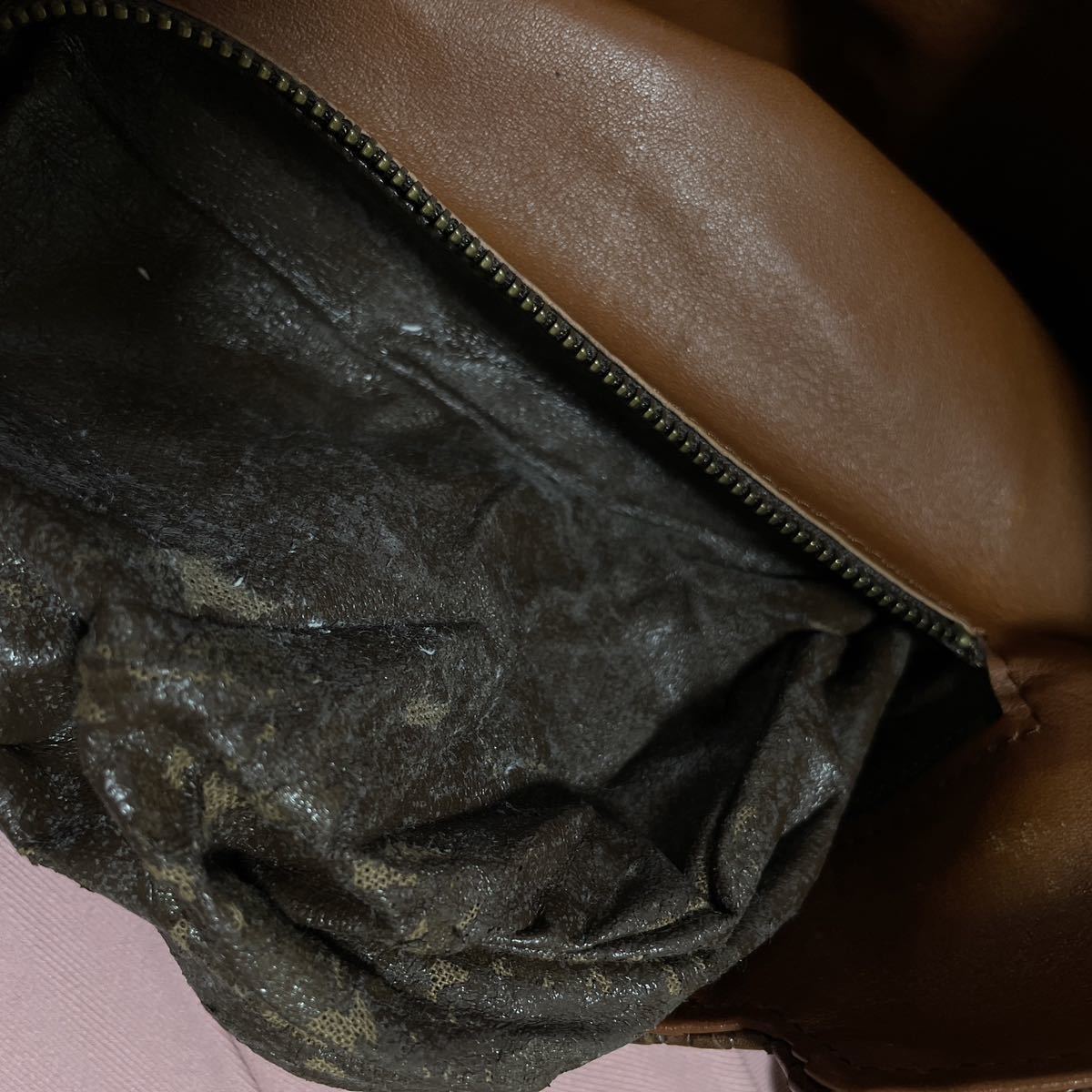 ▲内側にファスナー付ポケットがありますがポケット内のレザーに若干のベトつき、剥がれ、白っぽく乾燥した状態があります。ポケットを使用しないなら問題なく使用して頂けますがusedですのでご理解いただける方に