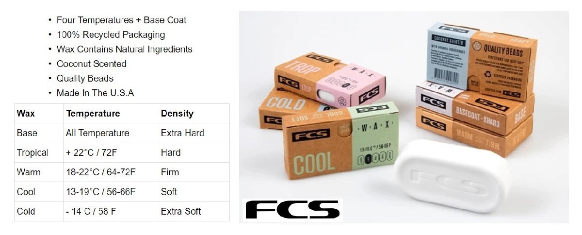 | 商品紹介 | 送料無料のFCS SURF WAX Tropical・WARM・BASE 3個セット (新品です。 FCSから新発売のWAX3種 各1個の計3個セットです。 ・Base All Temperature Extra Hard ・Tropical 海水温 + 22°C / 72F Hard ・Warm 海水温 18-22°C / 64-72F すべての水温で最高のグリップを実現する、 究極の粘着性と高品質のビード構築されています。 Four Temperatures + Base Coat 100% Recycled Packaging Wax Contains Natural Ingredients Coconut Scented Quality Beads Made In The U.S.A 発送は、入金確認後、日本国内何処でも レターパック郵便で発送いたします。 |