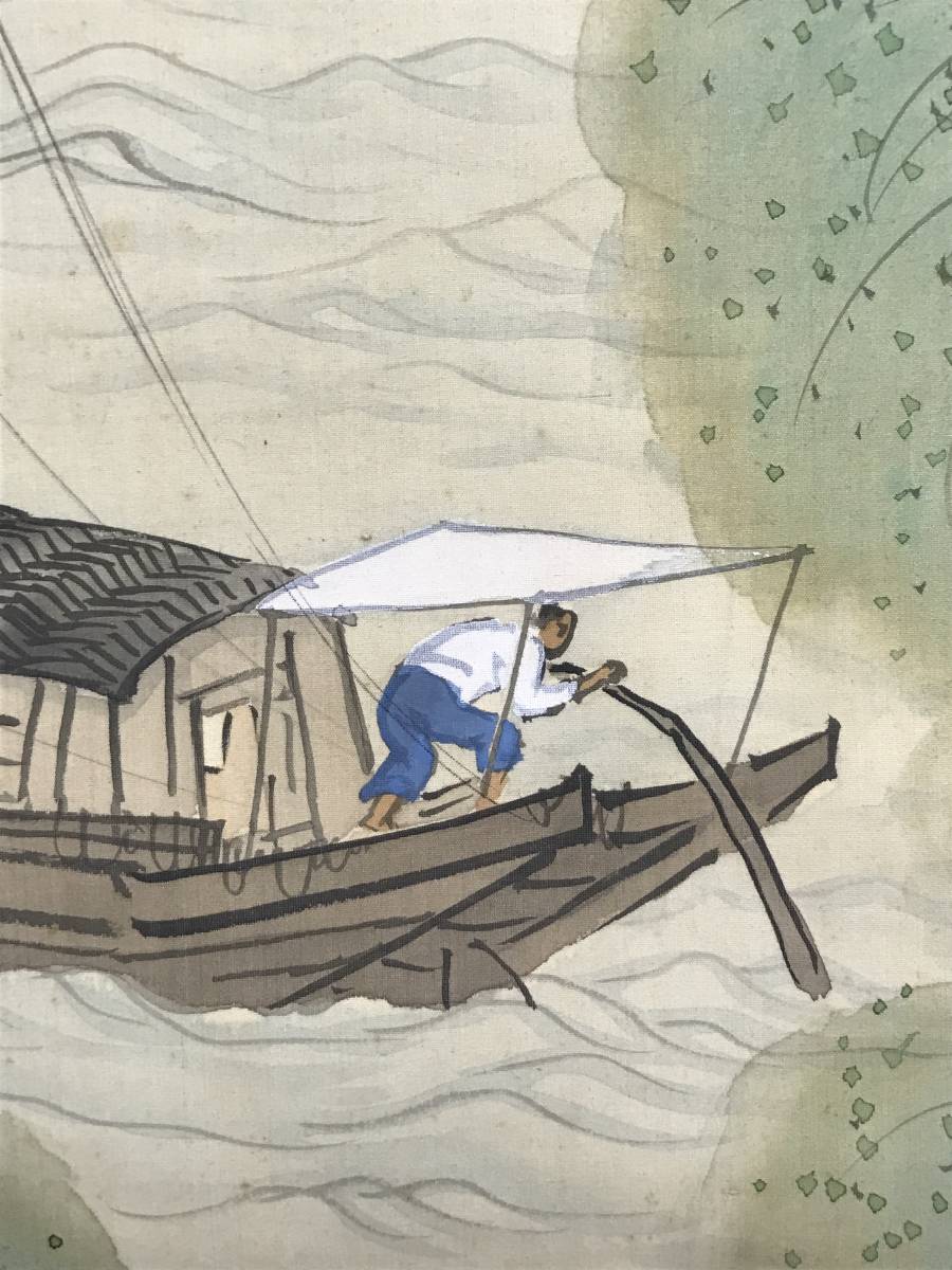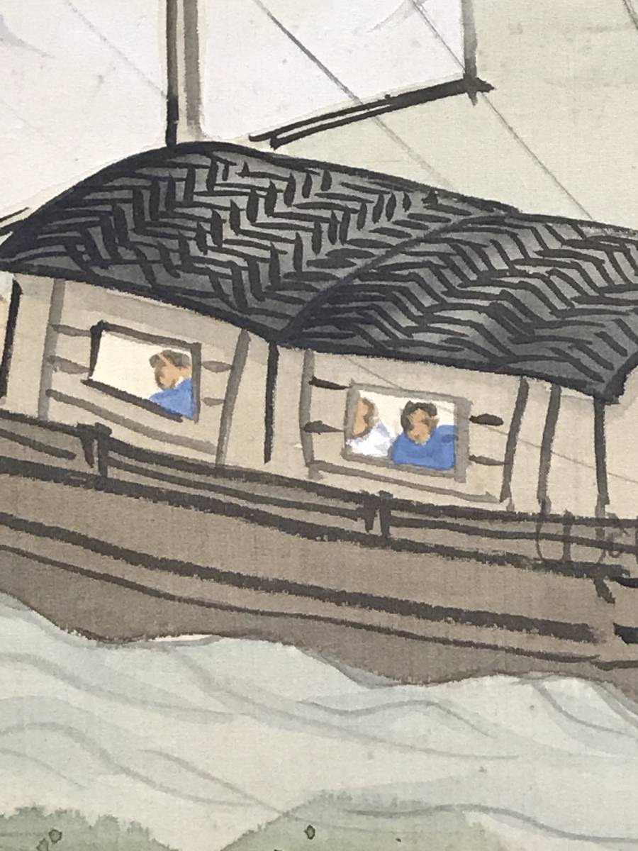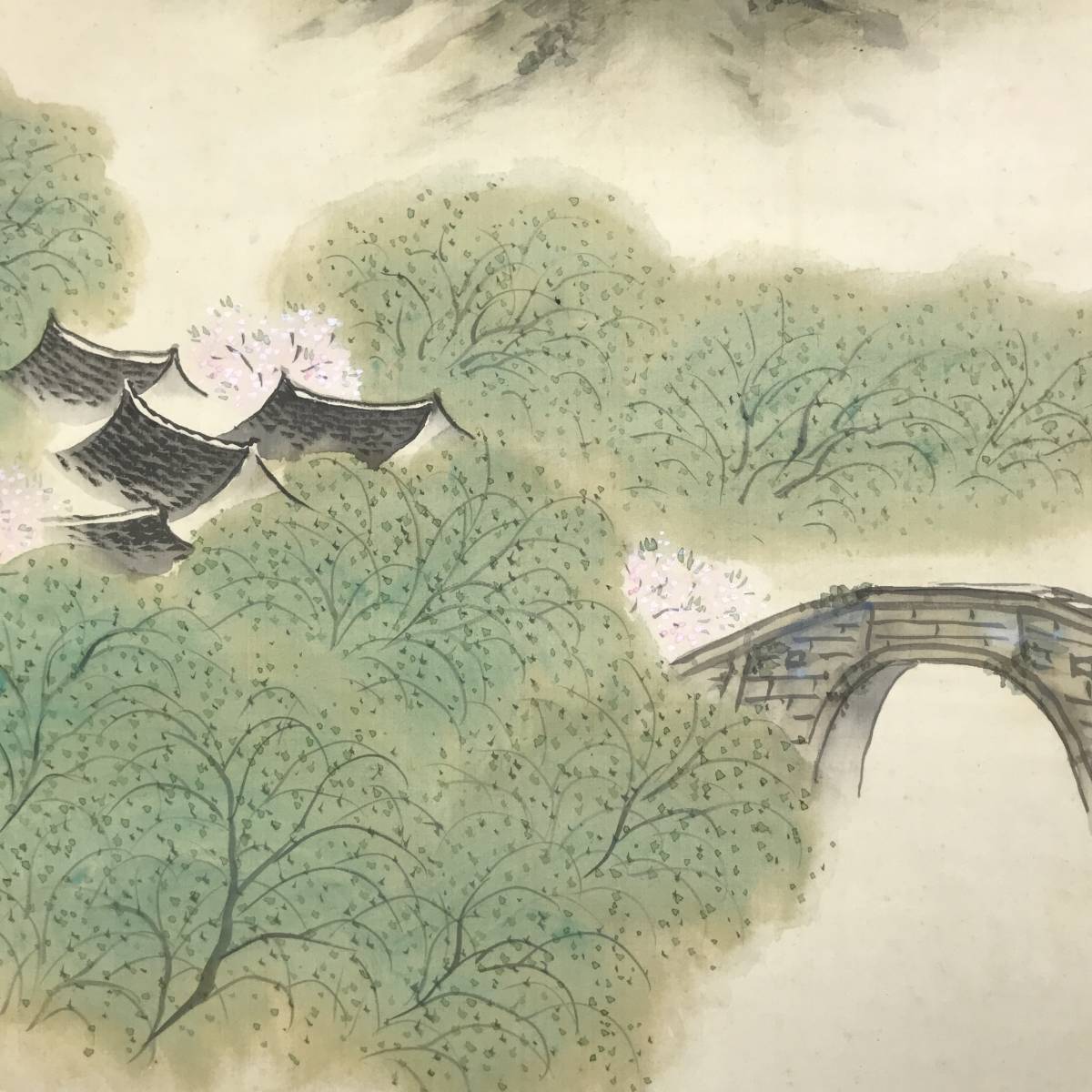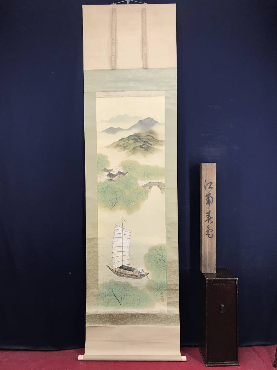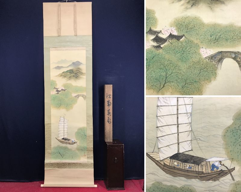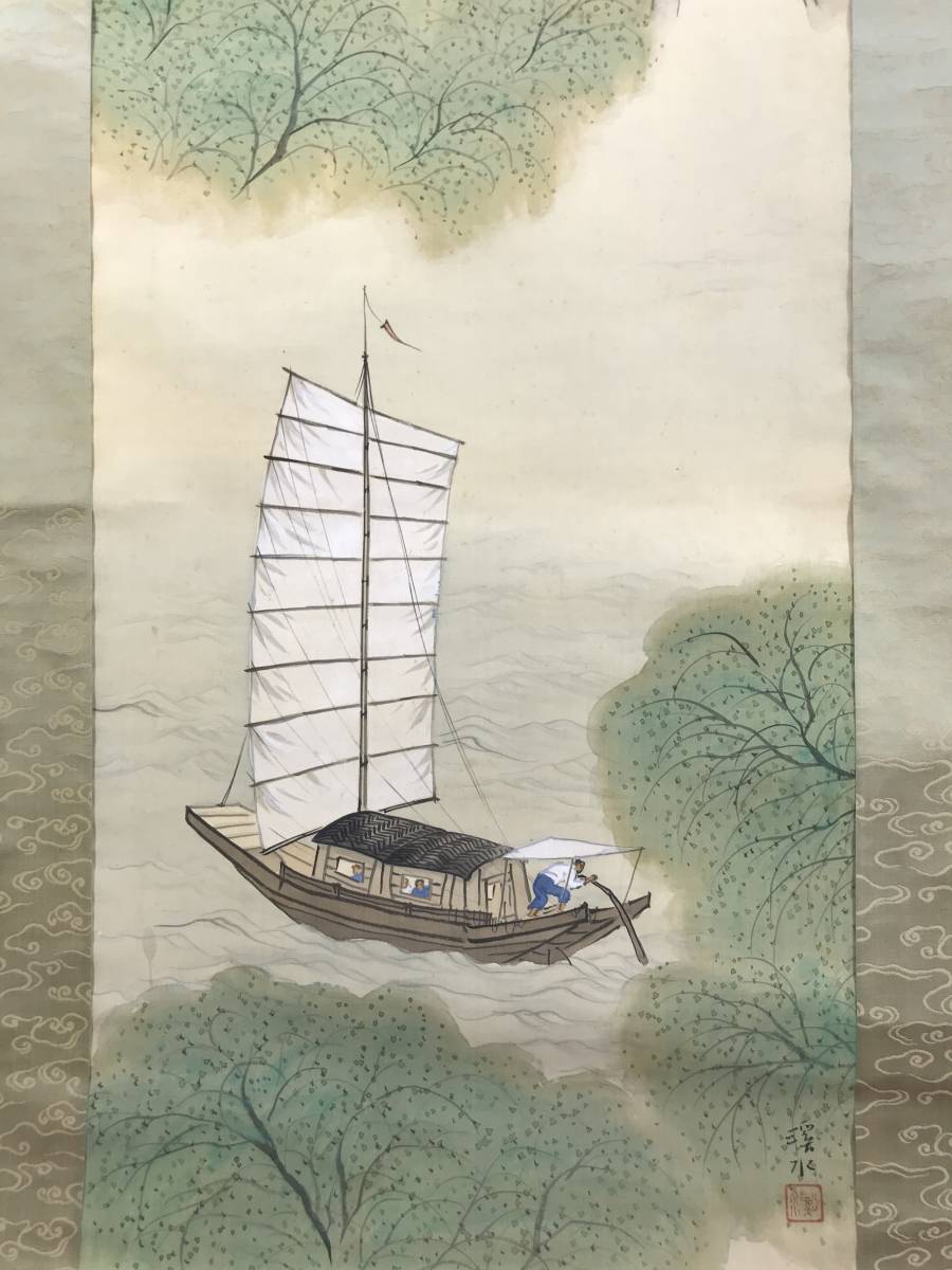 真作/渓水/江南春色/山水図/帆船図//掛軸☆宝船☆AD-172