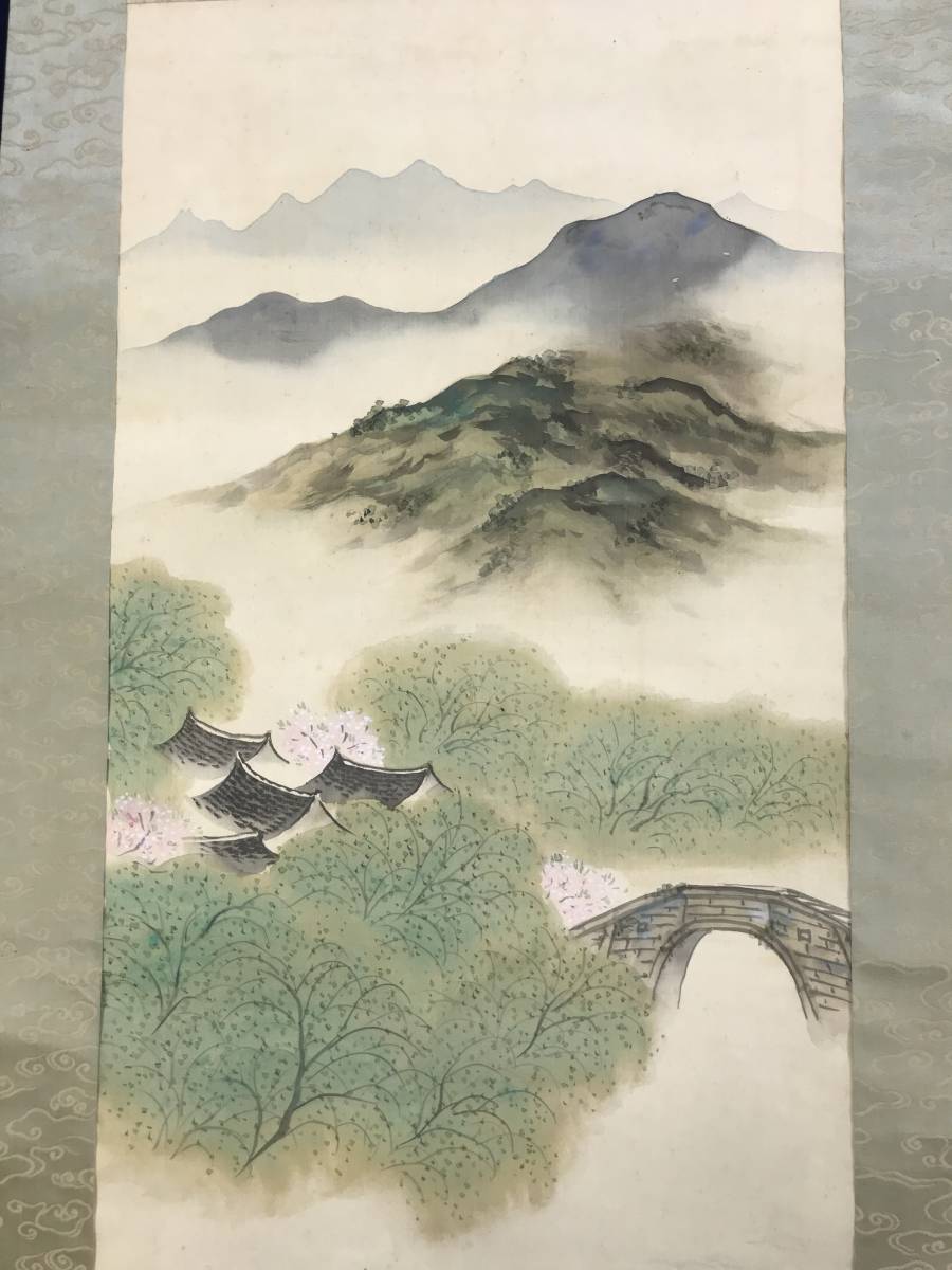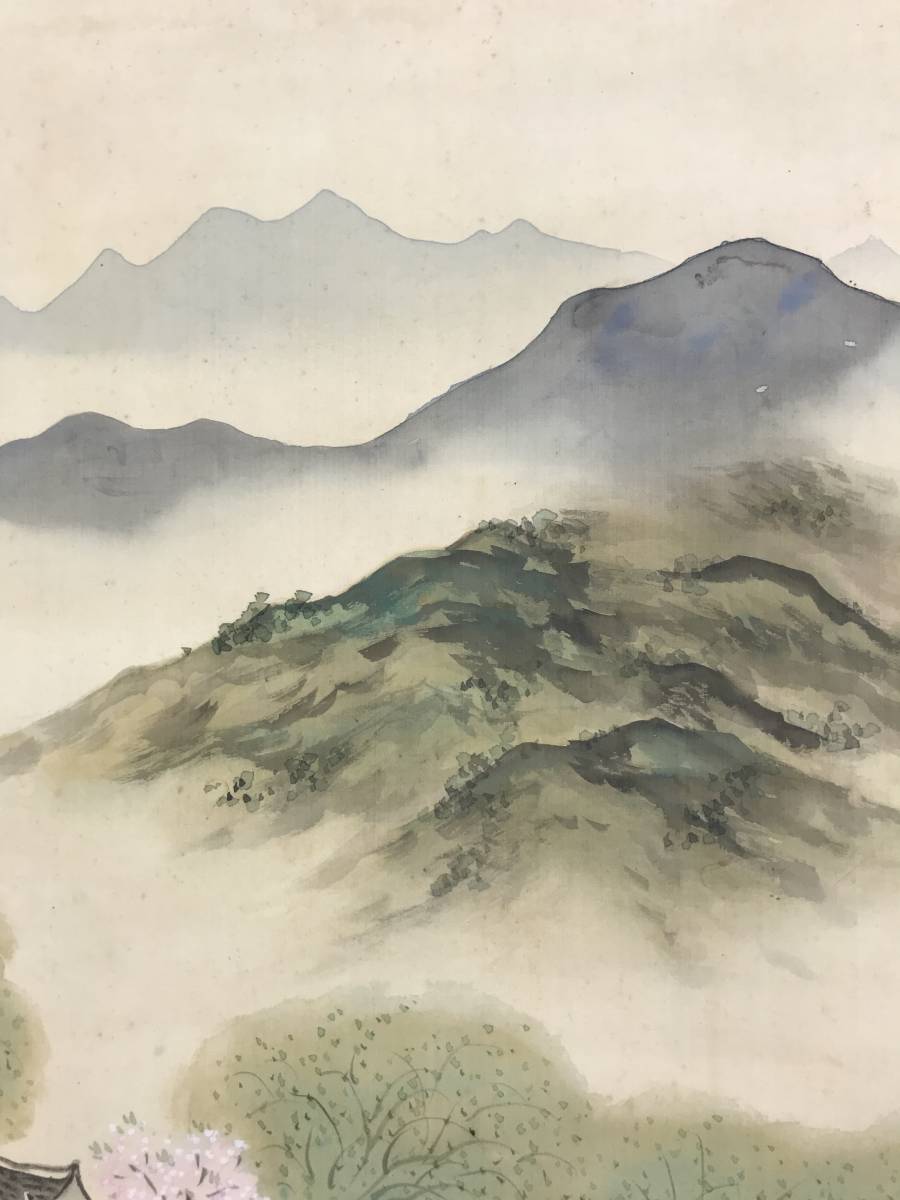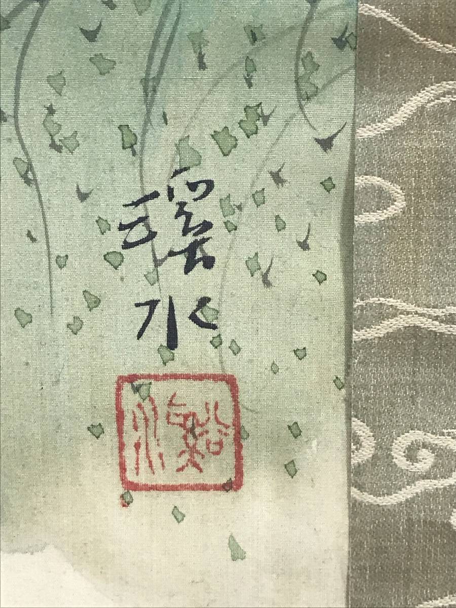 【作品状態】 本紙は絹本肉筆です。本紙は薄汚れ、全体に汚れシミ、糊シミあります。表装は絹表装で、天地に多数の汚れシミ、多数の糊シミ、巻シワなどあります。天地の状態は悪いです。