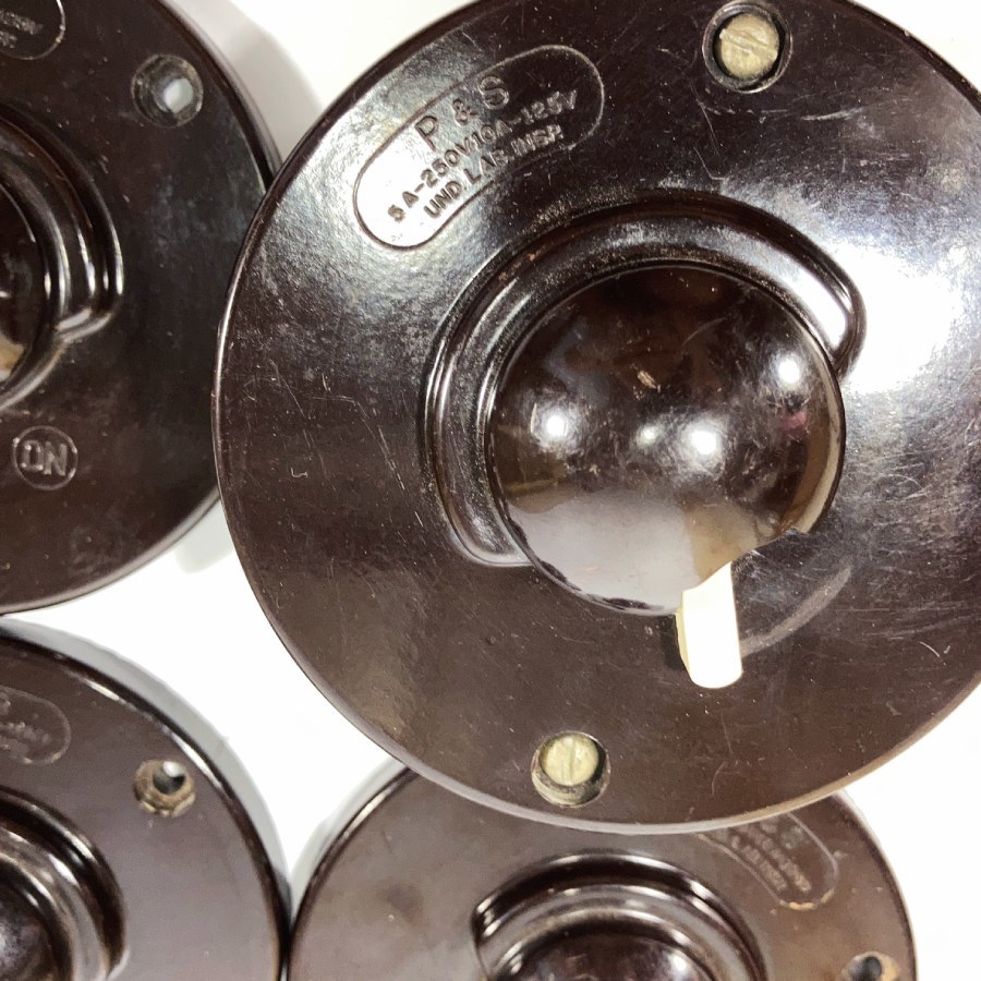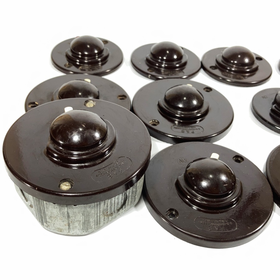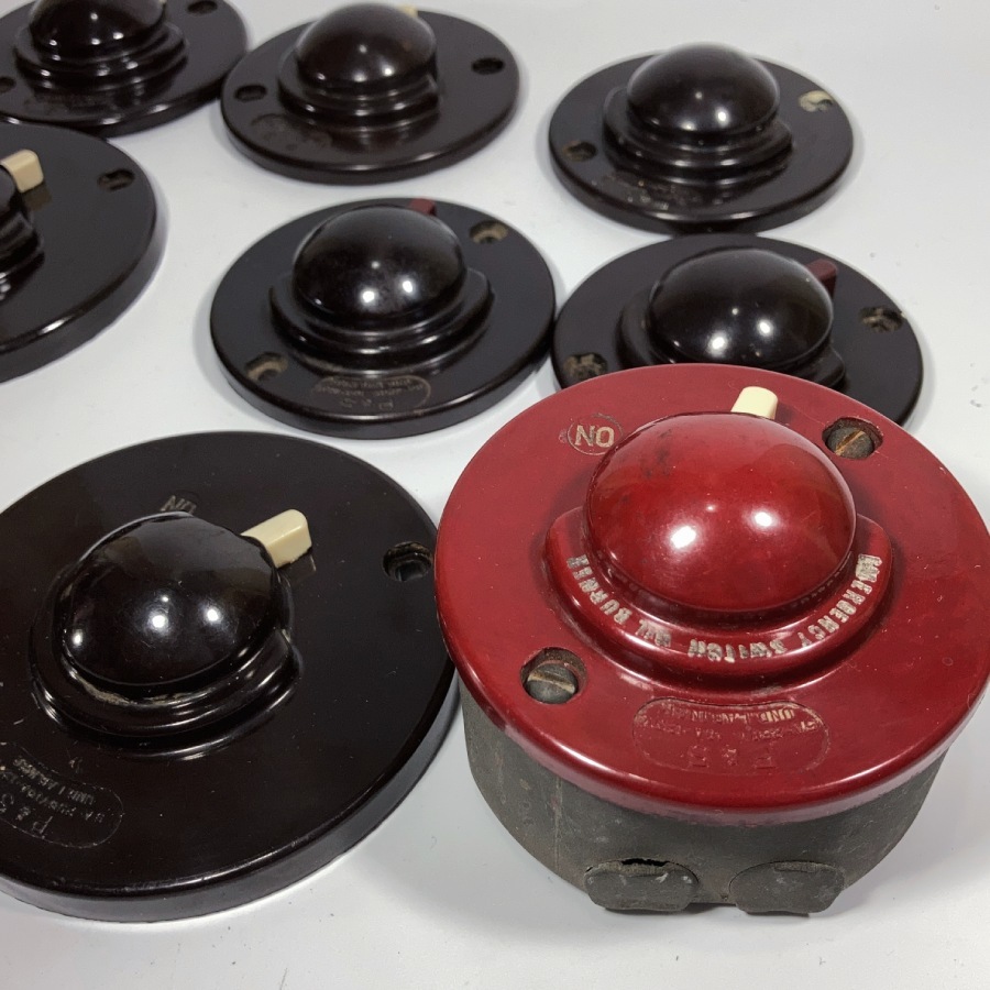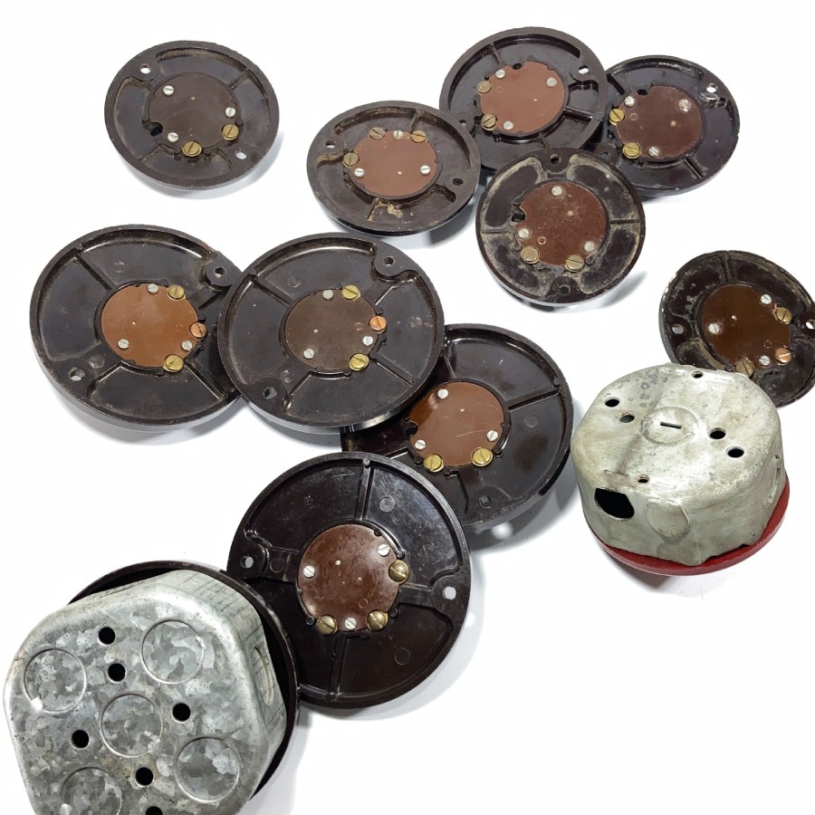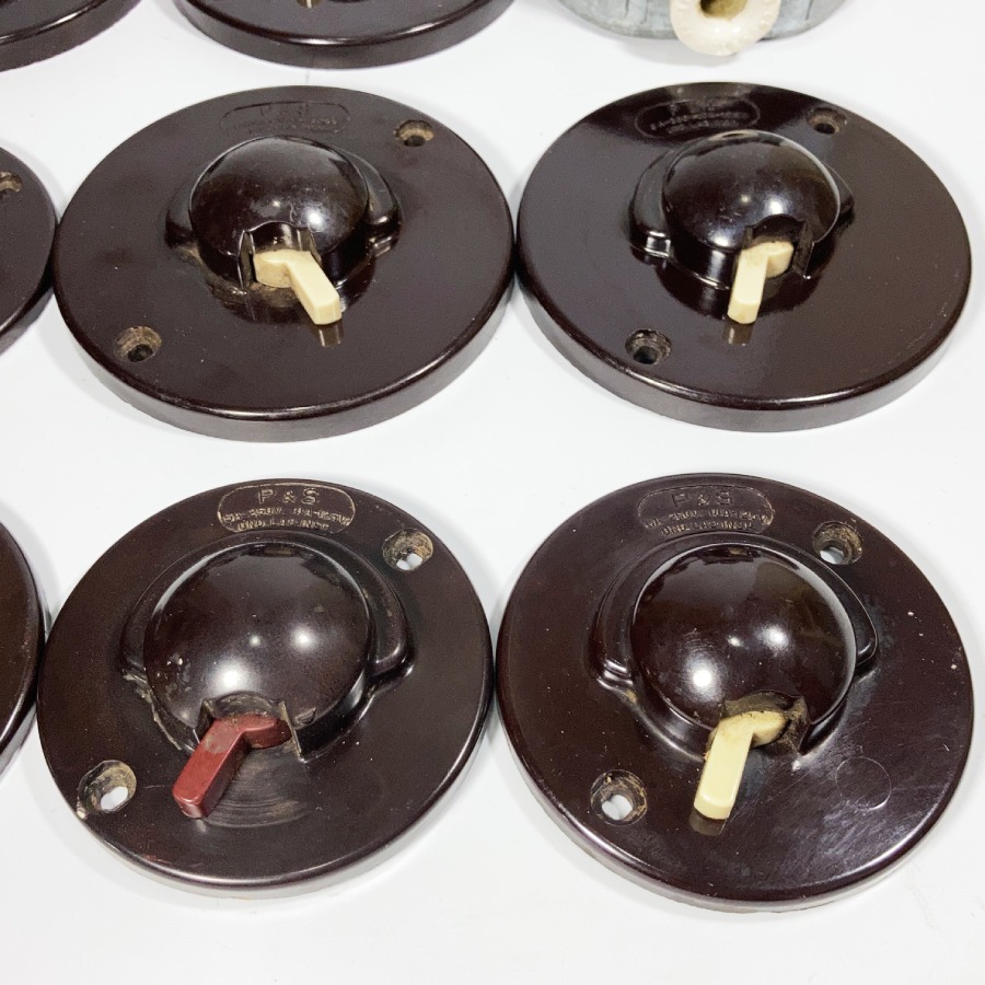 1920〜30年代頃のアメリカ製の丸型スイッチの12個セットでしたが… -*この度もう1個見つかりましたので、1個大判のワインレッドスイッチが追加になりましたがお値段は据え置きです。なので、画像にはございませんが、12個セットから【13個セット】となりました*- 丸いフォルムでデザインされたボディの下方からトグルスイッチが出ている近未来的な、アールデコ期バリバリの洗練されたデザインで存在感があります。このデザインにはなんだか愛嬌も感じますね。 個人的に気に入っていたので、15年かけてちょ〜っとずつ集めてきたスイッチとなり、結局14台しか見つからなかった大変珍しいスイッチです。 つい最近、 >> 2台だけバラバラで販売しました が、このタイミングで残りの12台をまとめて販売させて頂きます。 アメリカ本土でもまとめて出てきたりすることはまず無い商品ですので、もちろんこの数を集めようとすると15年以上は必ずかかるかと思います。 トグルスイッチ部はワインレッドとアイボリーがあり、ボディもダークブラウンとワインレッド(このワインレッドは “EMERGENCY SWITCH” としての色のようです)、さらに大(直径10.5cm)小(直径8.5cm)、スチールベース付き(一個は磁器製パーツ付き)んあどバリエーションに富んだセットです。 また、2枚目の画像向かって右側の6個はこの手のスイッチとしては珍しい "3路スイッチ" となります。画像の通りネジ止め可能な端子は3つとなります。 ですので、このスイッチを2個用いれば同じ照明を別の場所でON/OFF出来ます。 大小でそれぞれ1個づつボックス付きのものがありますが、取り外しも可能です。 ボックス自体はハンマーで強く叩いても凹まないくらい分厚い鉄製のボックスです。 ボックスを使用する場合、配管も使用するとインダストリアルな感じとモダンな感じが融合して良さそうですね。 裏面に経年の汚れや、表面にも経年程度の傷などはあるものの使用に際し著しくルックスを損なうほどのダメージなどはもちろん無く、使用にも全く問題の無いコンディションです。 これから改築や新築をお考えの方いかがでしょうか。 画像のまま、付属品は一切ございませんので、ビスなどは別途買い足して頂く必要がございます。 ◆SIZE◆ 大型の丸型ブレート直径は10.5cmです。 およそ5mmほどの穴〜穴の距離は9cmです。 小型の丸型ブレート直径は8.5cmです。 およそ5mmほどの穴〜穴の距離は7cmです。 |