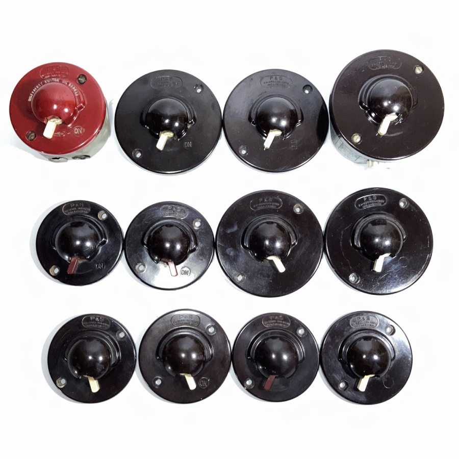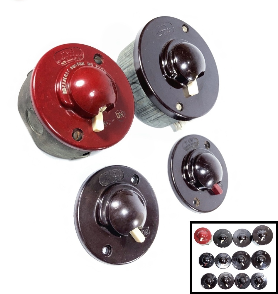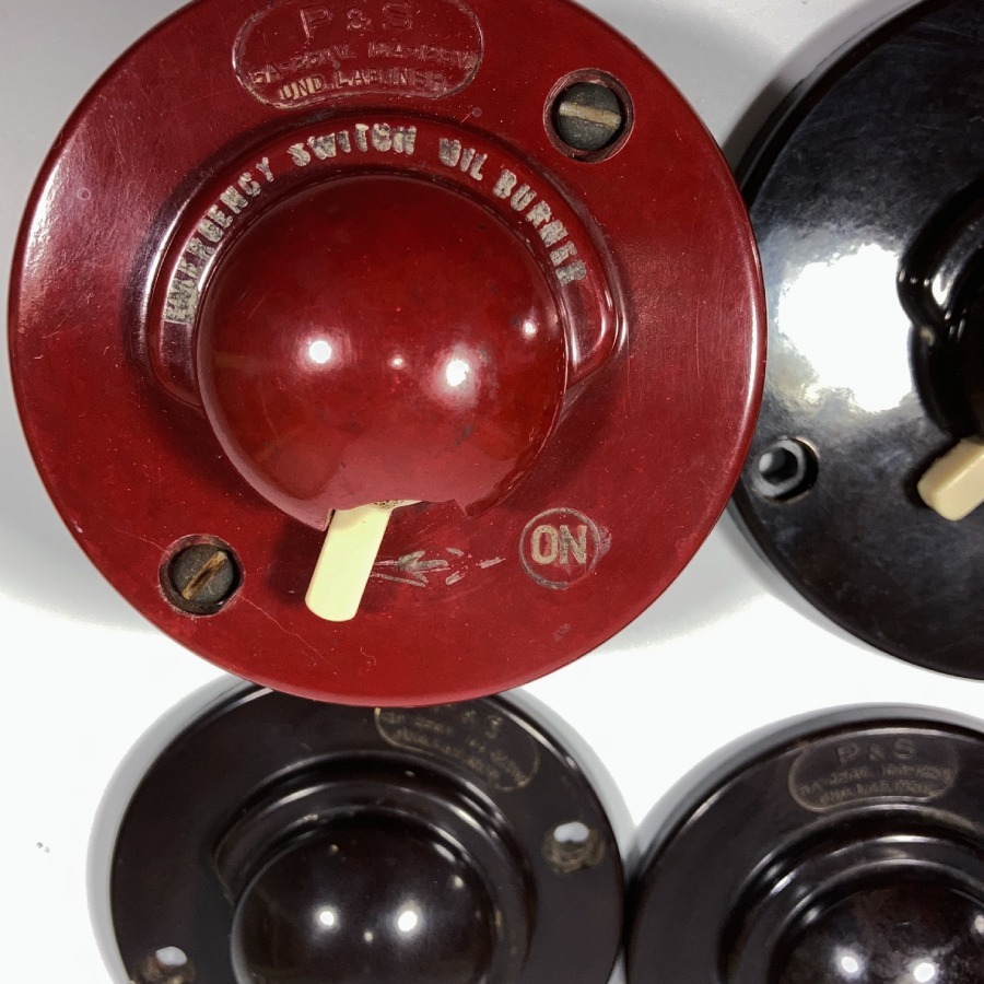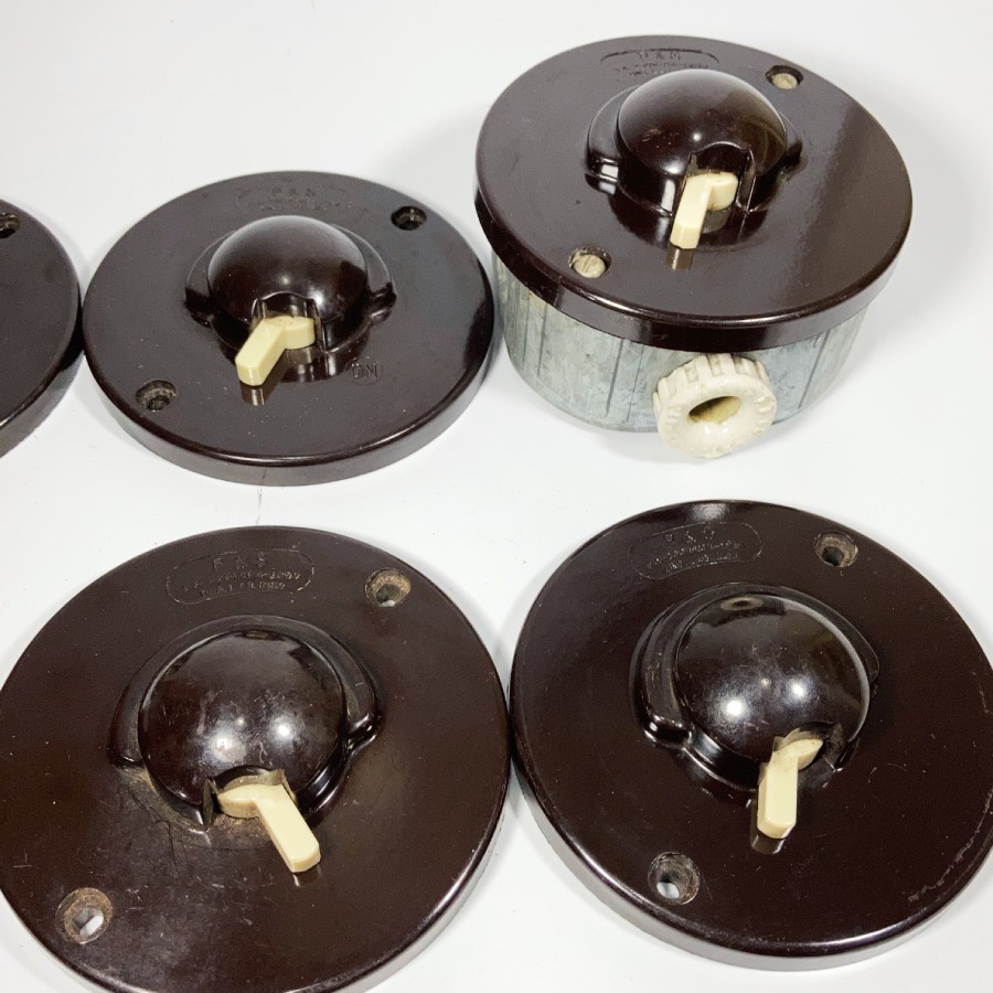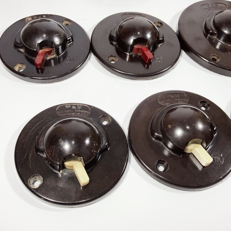 1920〜30年代頃のアメリカ製の丸型スイッチの12個セットでしたが… -*この度もう1個見つかりましたので、1個大判のワインレッドスイッチが追加になりましたがお値段は据え置きです。なので、画像にはございませんが、12個セットから【13個セット】となりました*- 丸いフォルムでデザインされたボディの下方からトグルスイッチが出ている近未来的な、アールデコ期バリバリの洗練されたデザインで存在感があります。このデザインにはなんだか愛嬌も感じますね。 個人的に気に入っていたので、15年かけてちょ〜っとずつ集めてきたスイッチとなり、結局14台しか見つからなかった大変珍しいスイッチです。 つい最近、 >> 2台だけバラバラで販売しました が、このタイミングで残りの12台をまとめて販売させて頂きます。 アメリカ本土でもまとめて出てきたりすることはまず無い商品ですので、もちろんこの数を集めようとすると15年以上は必ずかかるかと思います。 トグルスイッチ部はワインレッドとアイボリーがあり、ボディもダークブラウンとワインレッド(このワインレッドは “EMERGENCY SWITCH” としての色のようです)、さらに大(直径10.5cm)小(直径8.5cm)、スチールベース付き(一個は磁器製パーツ付き)んあどバリエーションに富んだセットです。 また、2枚目の画像向かって右側の6個はこの手のスイッチとしては珍しい "3路スイッチ" となります。画像の通りネジ止め可能な端子は3つとなります。 ですので、このスイッチを2個用いれば同じ照明を別の場所でON/OFF出来ます。 大小でそれぞれ1個づつボックス付きのものがありますが、取り外しも可能です。 ボックス自体はハンマーで強く叩いても凹まないくらい分厚い鉄製のボックスです。 ボックスを使用する場合、配管も使用するとインダストリアルな感じとモダンな感じが融合して良さそうですね。 裏面に経年の汚れや、表面にも経年程度の傷などはあるものの使用に際し著しくルックスを損なうほどのダメージなどはもちろん無く、使用にも全く問題の無いコンディションです。 これから改築や新築をお考えの方いかがでしょうか。 画像のまま、付属品は一切ございませんので、ビスなどは別途買い足して頂く必要がございます。 ◆SIZE◆ 大型の丸型ブレート直径は10.5cmです。 およそ5mmほどの穴〜穴の距離は9cmです。 小型の丸型ブレート直径は8.5cmです。 およそ5mmほどの穴〜穴の距離は7cmです。 |