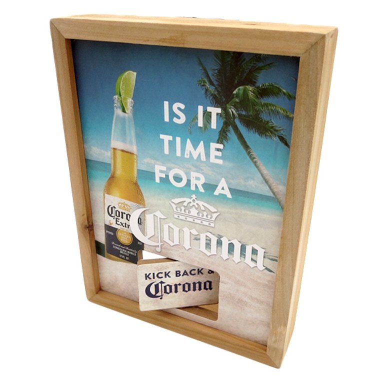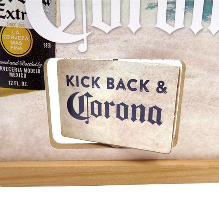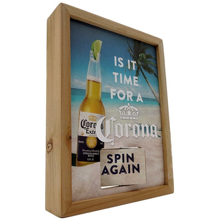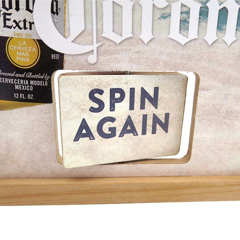 【217144】コロナビールのデスクトップ スピナー サインです。ちょっと小ぶりな木製のサイン♪ビーチにコロナビールという相性抜群でデザインに、『KICK BACK & CORONA』or『SPIN AGAIN』の両面スピナーが付いております。何をするかを決めるのが難しい時に、グルっとスピナーを回して決めちゃってくださーいコイントス的な機能を持った看板ですよっ背面には壁掛け用のフックがついています。壁掛け出来ますのでお部屋やお店のインテリアにもなりますね♪【サイズ】W155/D38/H203mm【材質】木製