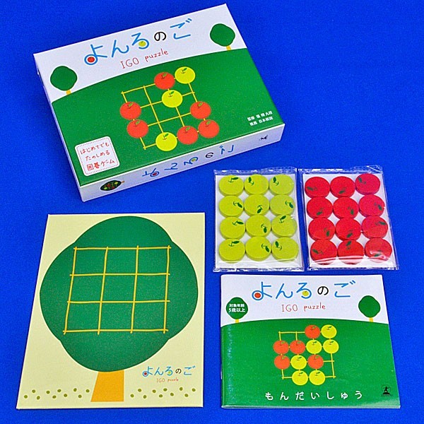 よんろのごは、囲碁界のエース・張栩(ちょうう)棋士が考案した囲碁のルールを使ったパズルです。囲碁盤を大きな木に、白黒の碁石を赤と青のりんごに変えて、頭を使いながら楽しく問題を解いていきます。