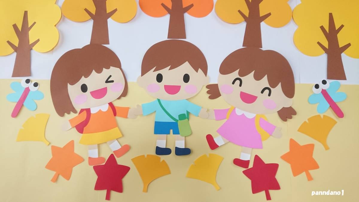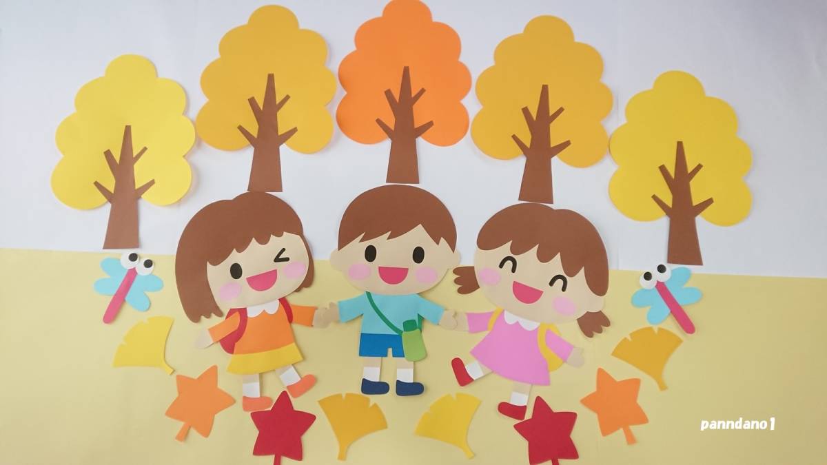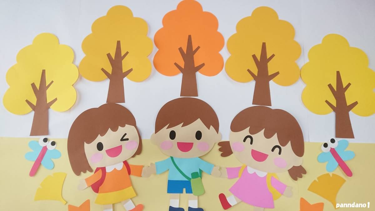 画用紙で作った『 秋の遠足♪』の大きい壁面飾りです(*^-^*)♪