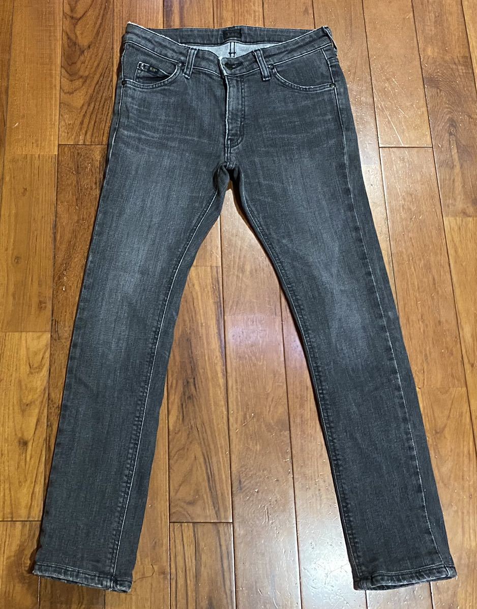 リーライダース×ナノユニバースのストレッチスキニーデニム(ジーンズ)、LB0161です。色はグレーです。USEDですが状態は良いです(10段階中8程度)。生地はストレッチ入りで綿98%、ポリウレタン2%です。牛革パッチ、ジッパーフライです。正規品です(リー・ジャパン(株)、日本製)。サイズはSでウエストは重ねずに平置きで約74cm、ヒップ約88cm、股上約23cm、股下約69cm、股下15cmのふともも部分約40cm、裾まわり約29cm、重量約490gです。発送はゆうパケットポストになります。