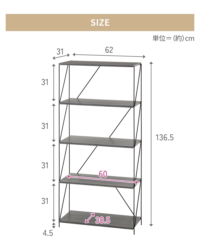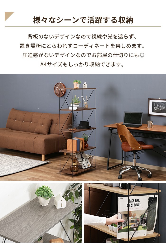 | 棚板の穴にワイヤーフレームを差し込むだけで完成する「ワイヤーロックシステム」を採用したオープンラック。 背面がないので、お部屋に圧迫感を感じさせません。 収納スペースは幅60×奥行30×高さ30.5cmで、A4サイズもしっかり収納できます。 背板のないデザインなので視線や光を遮らず、置き場所にとらわれずコーディネートを楽しめます。 重さは約12.3kgで、女性でも運ぶことができます。 |
