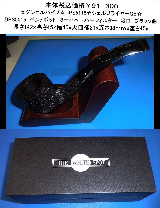 こだわりのダンヒルパイプ。現物を写真撮影、お手元にこの写真の品が届きます。シェルブライヤー G5(Group 5) シェープはベントポット。シャンクと吸口は4面ダイヤ型に加工。3mmペーパーフィルター仕様です。ブライヤーの表面をシェル加工し、黒色で仕上げている。ダンヒルの代表的なシェル仕上げ。ボウルは普通の大きさのパイプで吸い口がブラック。型番#5115 シェープ(5は大きさ/1は吸い口 テーパー/15はビリアード。)吸い口はドイツ製エボナイトの手作り品です。Group はG1/G2/G3/G4/G5/G6とあり、数字が大きくなるにしたがってパイプも大きいサイズになる。ビンゴが出品している全ての商品は、店頭販売、オークション販売、ショッピング販売等重複し販売しております。時間差で売れ切れや、出荷点検検等で傷が付いていたり破損している事もあります。従いまして、お買い上げ頂きましても出荷出来ない場合も有りますので、予めご了承の上お買い求め下さい。ご注文商品は他商品と同梱配送出来ますので、何個ご注文されても送料は1口分です。1.レターパック発送 ¥600 日時指定不可。(郵便レターパック)。2.宅配便発送税込み ¥880日時指定必須(沖縄/離島は別途価格)。必ず 受取日時 をご指定下さい。(例:15日 18~20 時必着)再配達防止の為。 (業者は当社にお任せ)。3.代金引換発送引手数料税込み ¥1、210 日時指定必須(沖縄/離島は別途価格)。 必ず 受取日時 をご指定下さい。(例:15日 18~20 時必着)再配達防止の為。