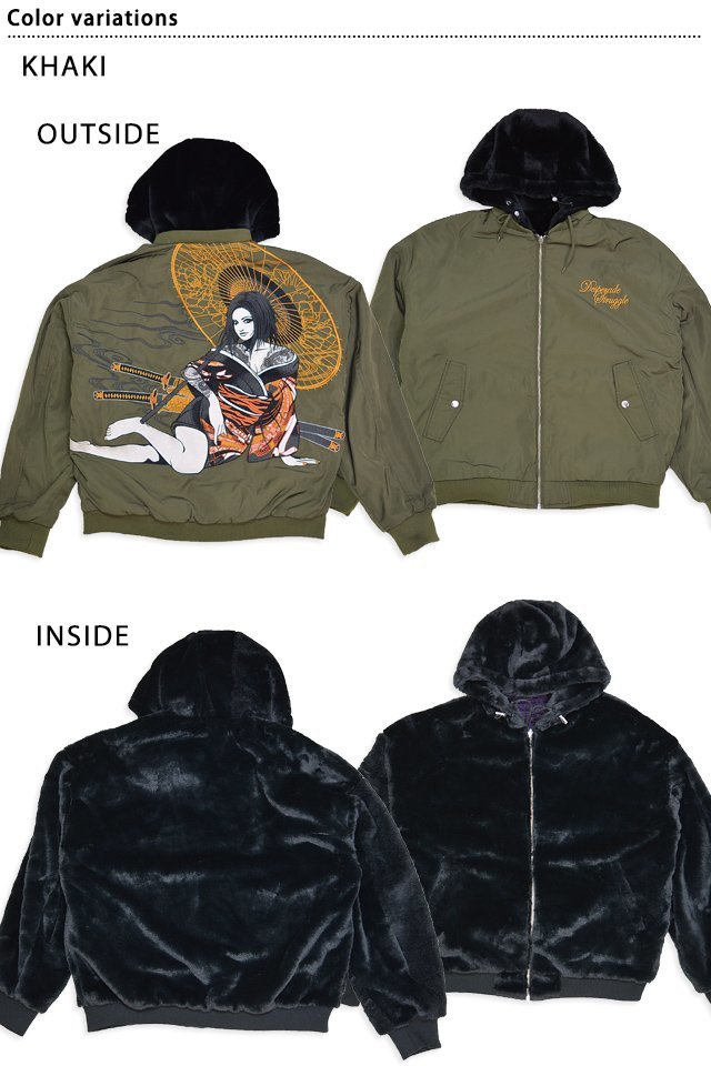 絡繰魂の姉妹ブランドとして誕生した、従来の和柄から抜け出し、和の持つ美しさを融合させた【抜刀娘】から「抜刀娘 凛リバーシブルMA-1ブルゾン(234013)」のご紹介です。 表裏どちらも使えるリバーシブルタイプのアウターが登場しました! 今回は贅沢な総刺繍デザインとなっております。 着物や帯の柄まで細かく描き込みが施されているところも抜刀娘ならでは。 フロントはジップアップ仕様。 | |||||||||||||||||||||||||