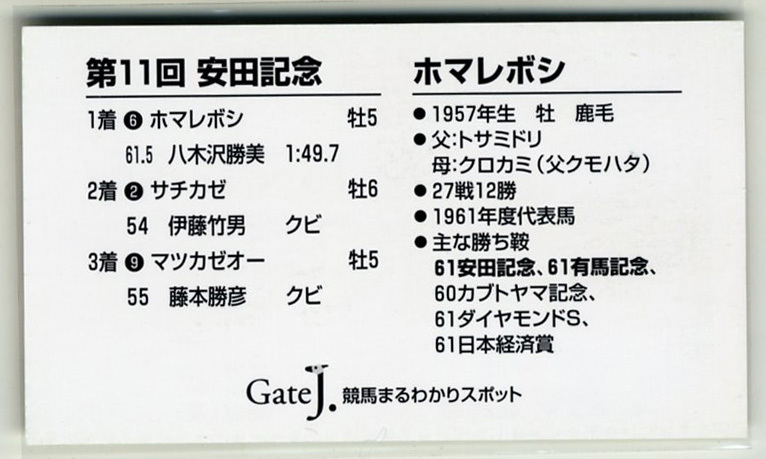 | ★非売品 ホマレボシ 第11回安田記念 単勝馬券型 カード JRA Gate J.名馬カード 八木沢勝美 有馬記念馬 写真 画像 競馬カード 即決 | |