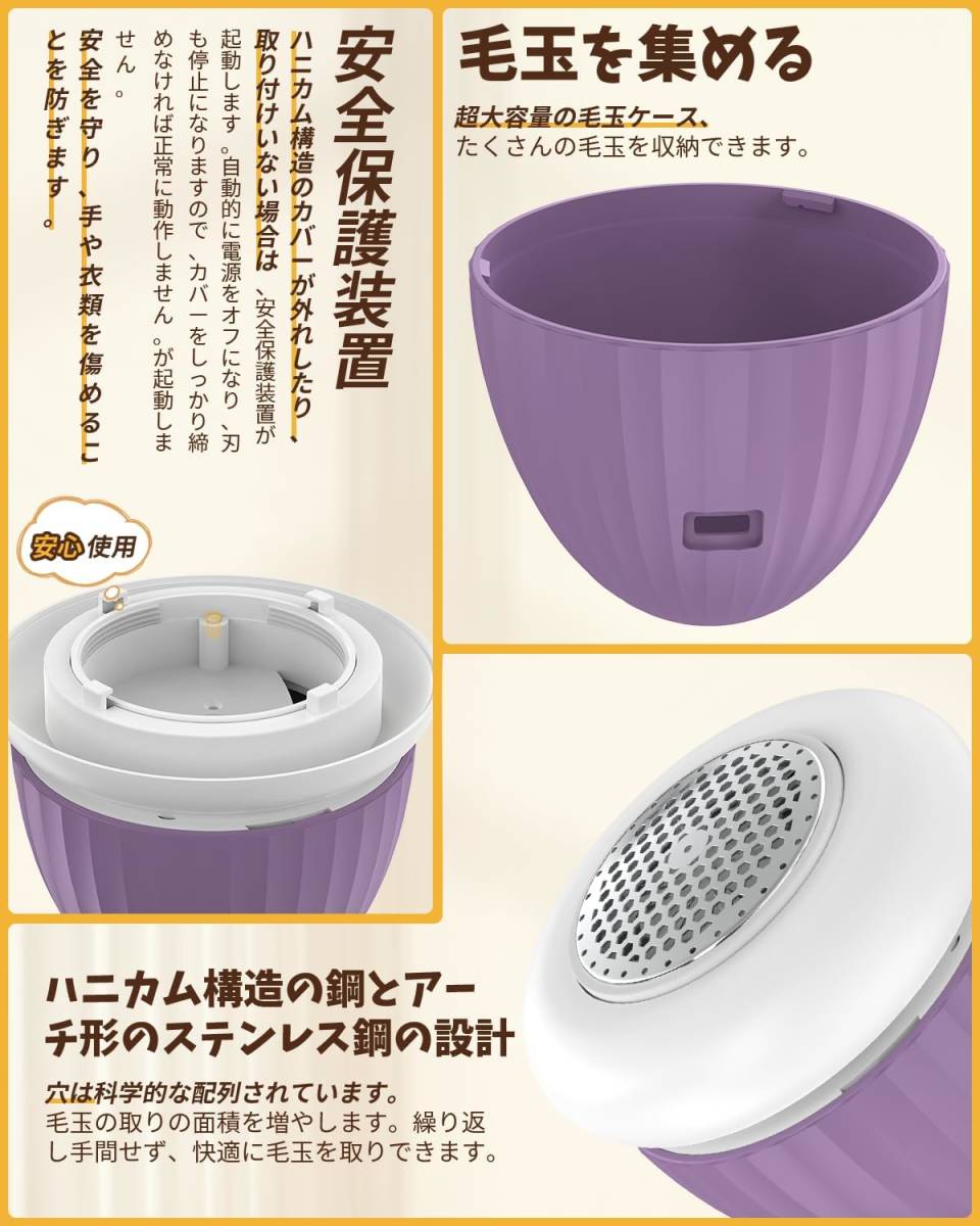 安全スイッチが付いており、外刃を外した状態では安全スイッチが働き、モーターは回転しません。高速回転するカミソリでの怪我を防ぎます。お子様が使用しても、安全に使うことができます。大容量の毛玉ケースので、たくさんの毛玉を収納できます。