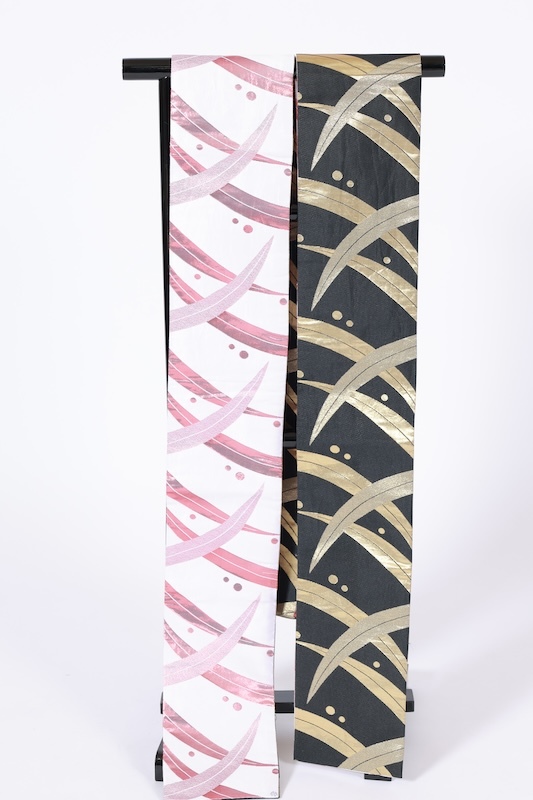 黒をベースにゴールドで露芝を織り上げ、裏は優しいピンクにピンク泊で露芝を織り上げたお品になります。舞台用やお稽古着にご着用ください。