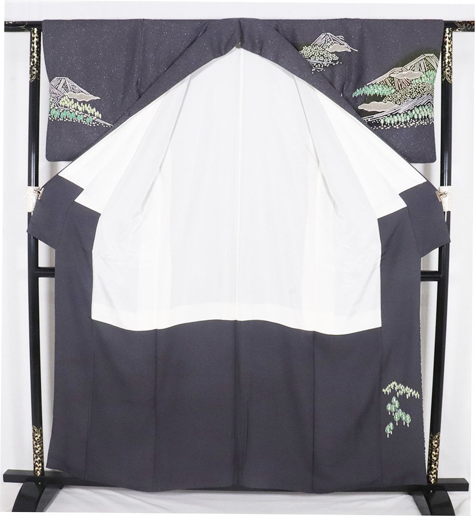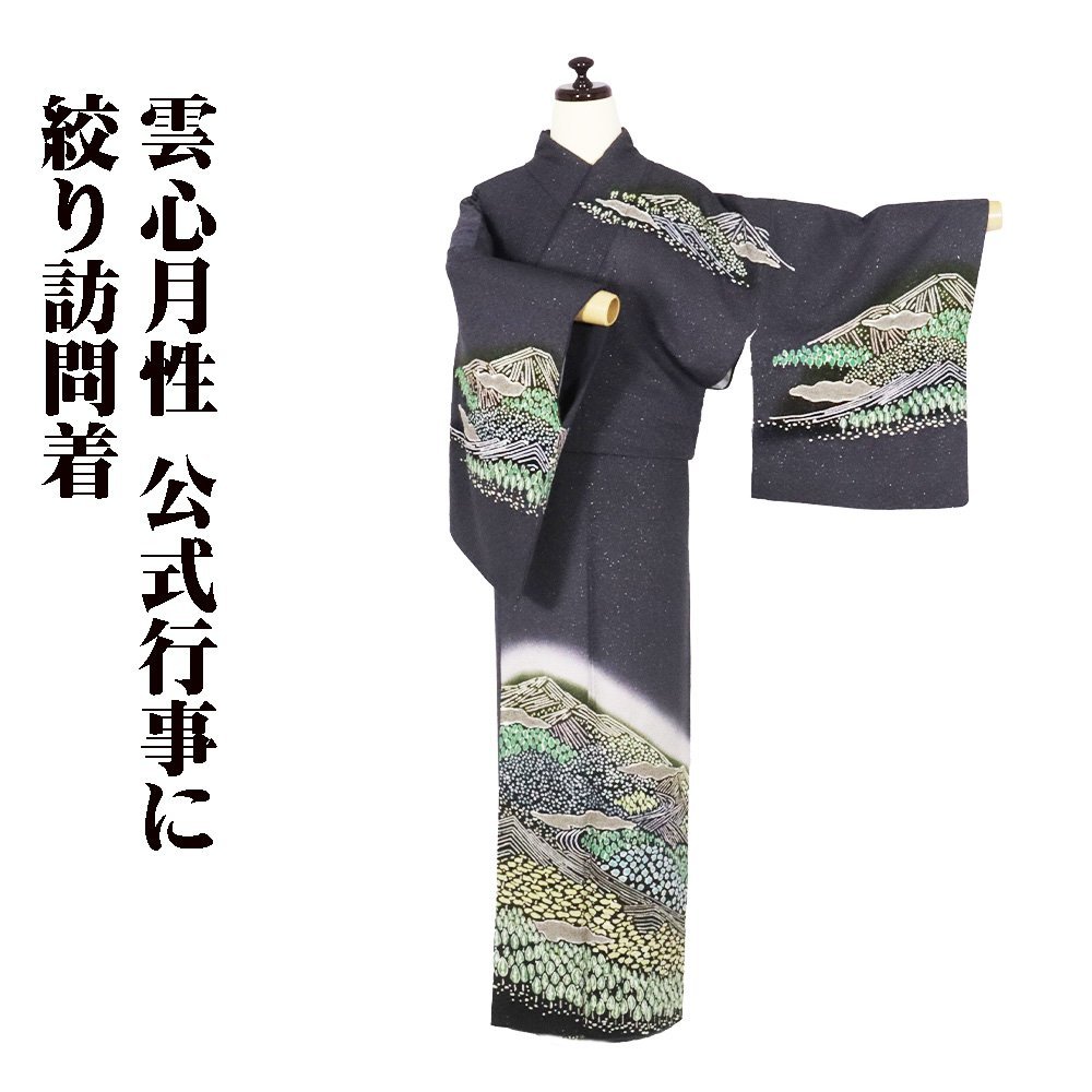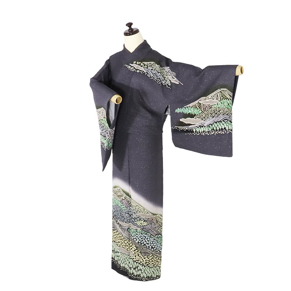 | おぼろ絞り 訪問着 袷 丹後縮緬地 グレー暈し地 銀糸通し地 おぼろ絞り・遠山・桜・北山杉 165 広襟 |